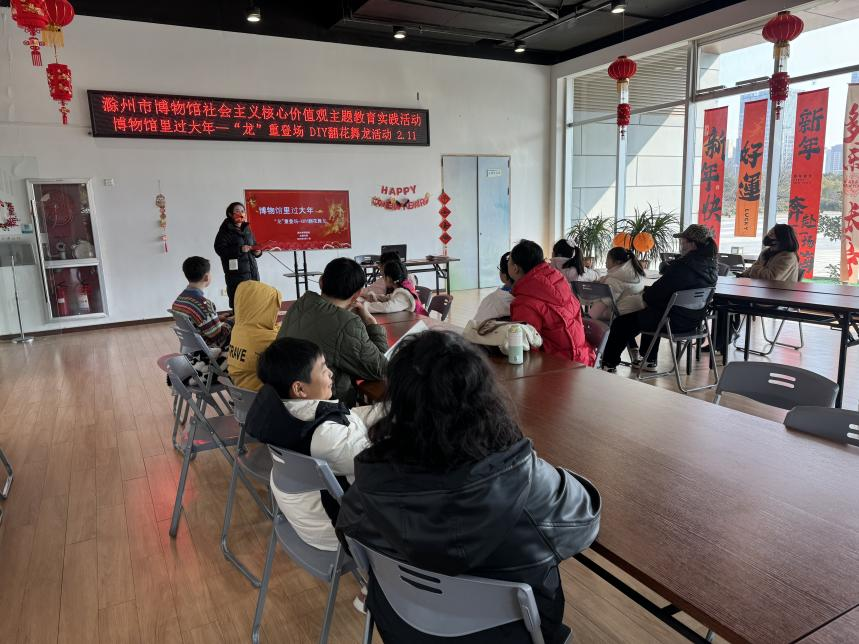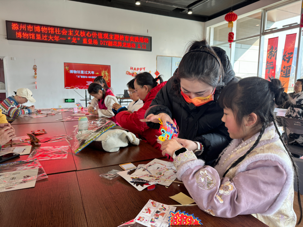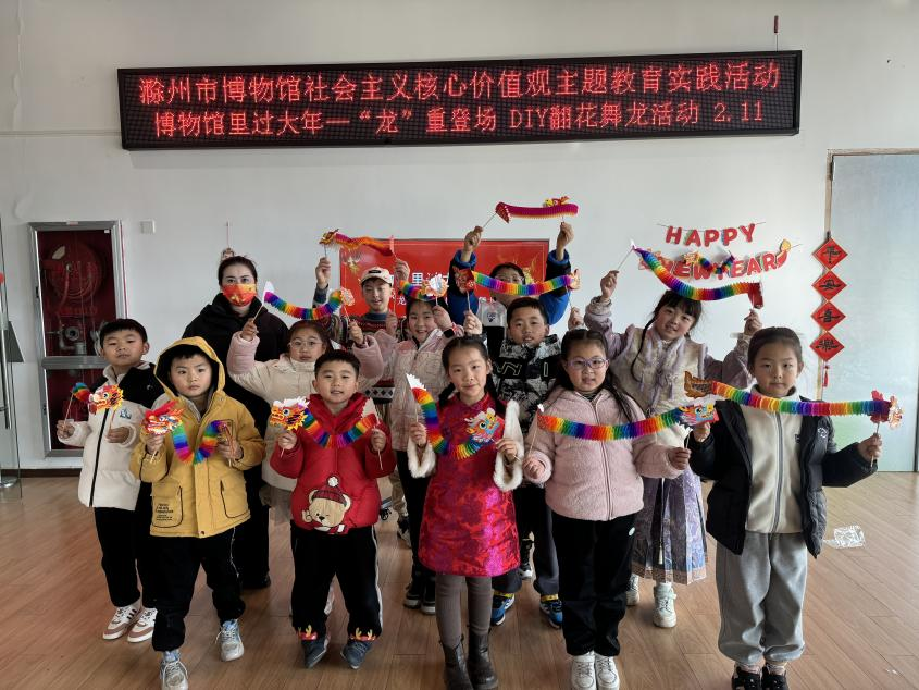 活动开始,博物馆讲解员分别讲述了“龙”字的含义、十二生肖中龙的由来、滁州博物馆里“龙”元素文物《葵口云龙纹镜》以及非遗纸翻花的工艺。孩子们听的十分认真,眼睛里充满着好奇,纷纷搓着小手跃跃欲试。“可以开始动手做翻花纸龙啦!”随着讲解员的一声令下,孩子们的热情瞬间被点燃,大家充分发挥想象力和动手能力,有的先拼龙头,有的先粘龙尾,有的用彩纸折叠龙身,不一会儿龙的各个部位就做好了,大家用胶水把龙头、龙身、龙尾按顺序粘贴在小木棒上,一条条“祥龙”在孩子们的手中舞动了起来,灿烂的笑容洋溢在孩子们的脸上。最后,孩子们带着自己的“翻花舞龙”一同合影留念。