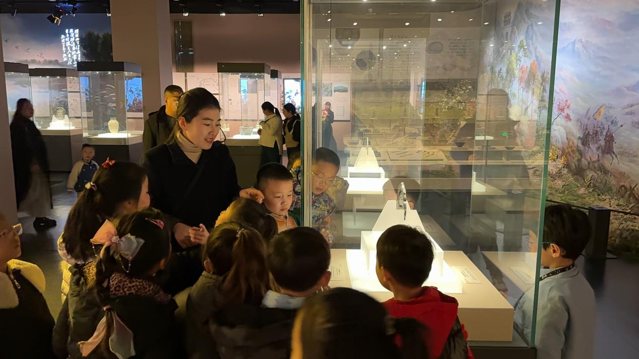 本次二十四节气里的滁州文物介绍的是“菱形麒麟鹦鹉花草镜”,国家一级文物。在历史展厅文物展柜前,讲解员向孩子们讲述了此件文物的朝代、功能、纹饰图案等,让大家进一步了解博物馆里的文物。