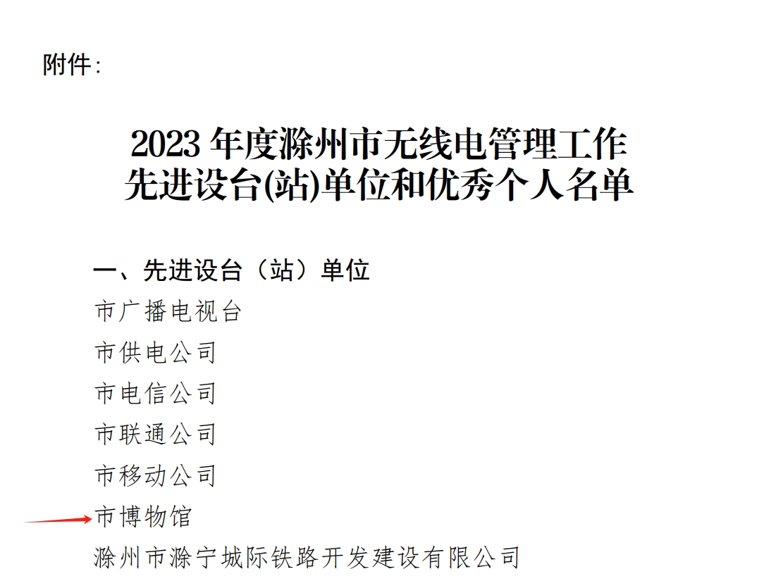 近日,安徽省无线电管理委员会办公室滁州管理处下发《关于2023年度滁州市无线电管理工作先进设台(站)单位和优秀个人的通报》(皖无滁〔2024〕6号),我馆获得2023年度滁州市无线电管理工作先进设台(站)单位荣誉称号,我馆职工周彧弢同志获评2023年度滁州市无线电管理工作优秀个人。
