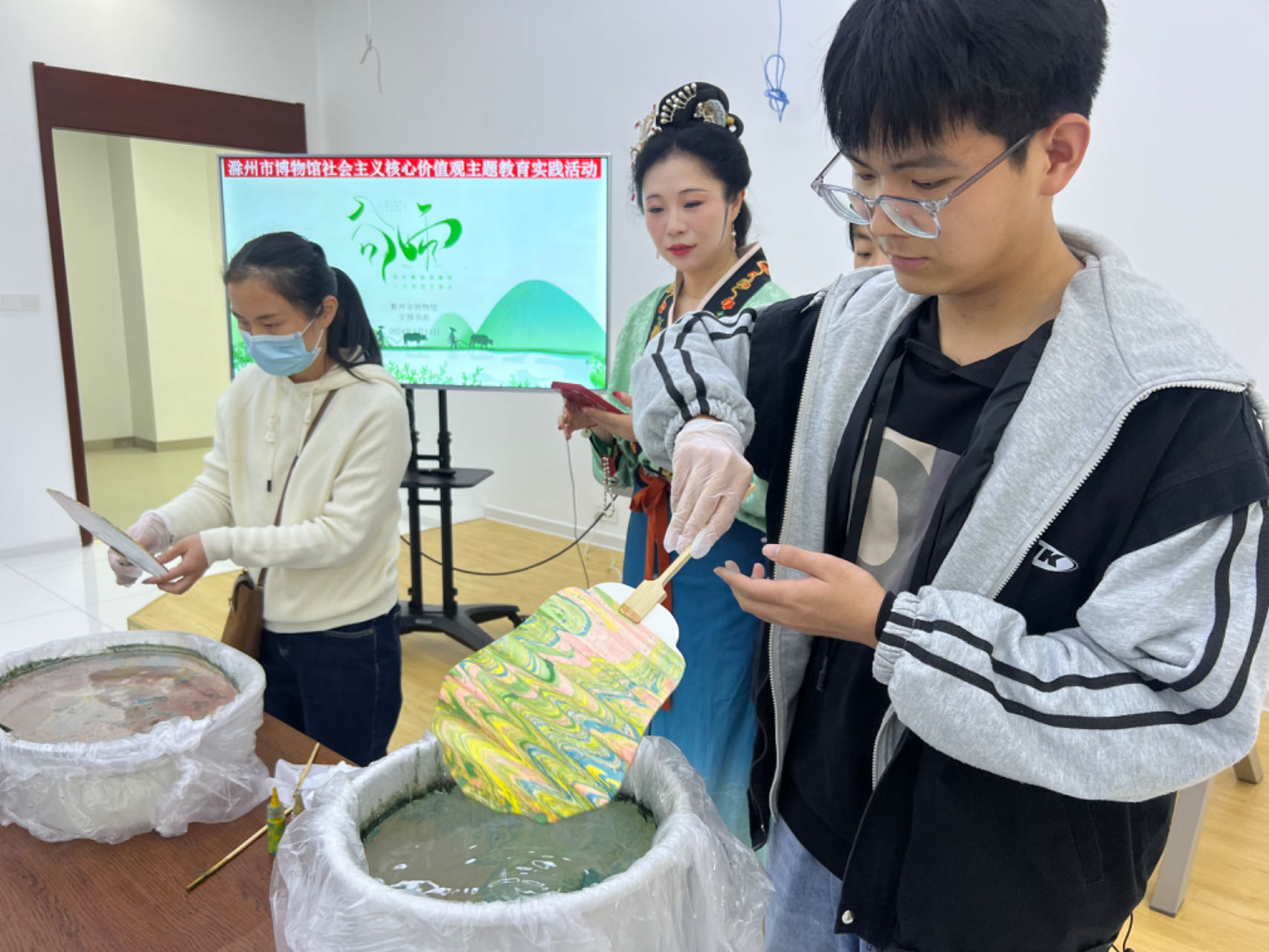 在手工制作漆扇环节,讲解员给大家介绍了漆扇的历史以及制作工艺。随后,大家在讲解员的指导下将各色生漆漂于水面,调出自己喜欢的颜色,以上下、左右、旋转的方式将纸扇浸入水中,给纸扇漂上纹路和颜色。看着团扇没进斑斓的水中,再拿出显现独特的图案,一把把独一无二、色彩各异的漆扇就展现在大家的眼前。