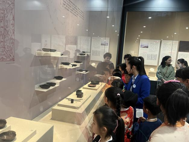 活动开始,许薇老师首先给大家介绍了立夏节气的由来、习俗以及关于立夏的诗词。紧接着讲解员带大家走进博物馆二楼历史展厅,为大家介绍了馆藏文物漆耳杯原料的由来、制作方法等相关知识。