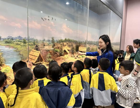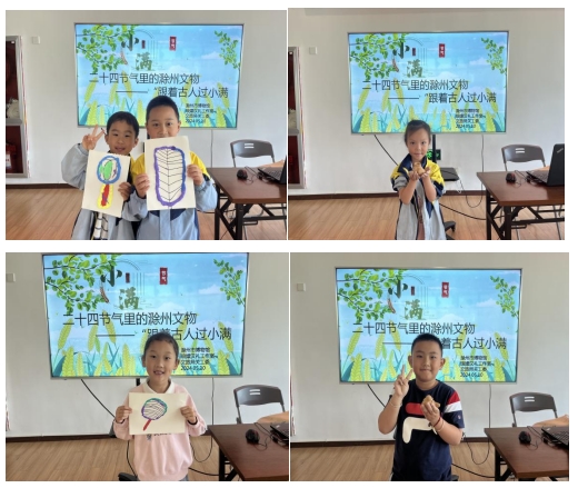课堂上许薇老师通过图文并茂的PPT课件,让孩子们了解了关于“小满”节气的起源、常识、习俗,和孩子们一起朗诵了与“小满”有关的诗词。同时也让孩子们了解了小满中的“满”,指雨水充盈,是蓄水种植水稻的好时节。随后讲解员老师带领孩子们参观了博物馆历史展厅侯家寨遗址中的水稻复原场景,让孩子们了解古人种植农作物的时间及水稻的生长过程。