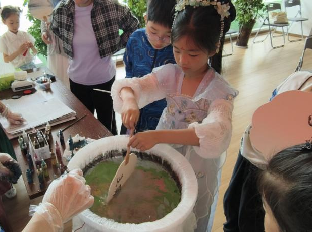 此次节气手工是非遗漆扇,许薇老师介绍过漆扇制作工艺和漆的特点后,大家在老师的指导下,将各色生漆漂于水面,调出自己喜欢的颜色,以上下、左右、旋转的方式将纸扇浸入水中,给纸扇漂上纹路和颜色。看着一把把团扇没进斑斓的水中,流光溢彩的中国色漂入团扇,显出独特的图案,大家满怀笑颜。完成漆扇制作后,大家自豪地展示了他们的作品。色彩斑斓的漆扇展现了大家的创意和个性,它们不仅是艺术品,更是非遗文化传承。