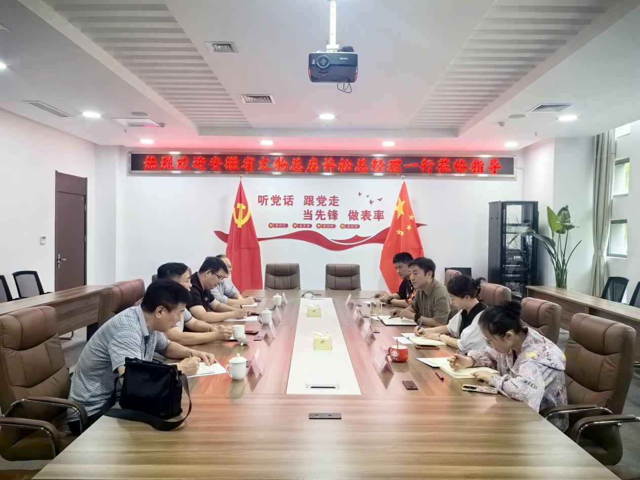 6月27日上午,安徽省文物总店总经理许松一行莅临我馆考察指导工作,副经理丁飞、办公室主任张勇、保管部副主任王盼盼随同。许松一行实地参观我馆临时展厅和一楼中庭等,详细了解我馆临时展厅、文物馆藏和文创产品等情况。陈磊馆长代表博物馆对省文物总店一行表示热烈欢迎。