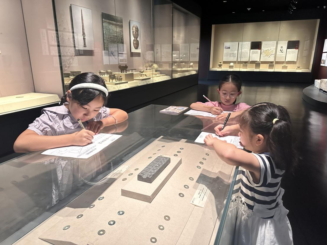 随后,小朋友们来到文物展柜前,拿起画笔发挥各自的绘画技法,勾线、涂改、描纹,一幅幅精美灵动的画作跃然纸上,多件馆藏文物在大家的画笔下,呈现出异彩纷呈的模样。