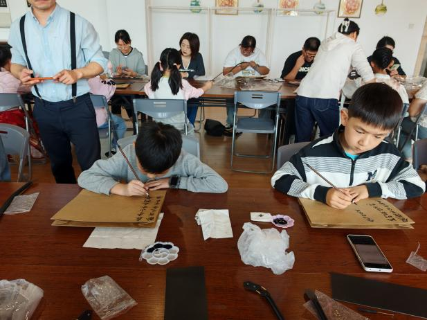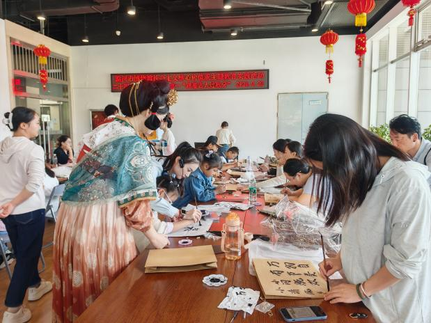 体验制作环节,孩子们神情专注,认真聆听老师讲解和示范。巧手出佳作,一支毛笔,一张纸,不一会儿一幅幅独一无二的书法作品就完成了,紧接着大家开始进行组装书法包工序,成功做出了一个个精美的书法包。