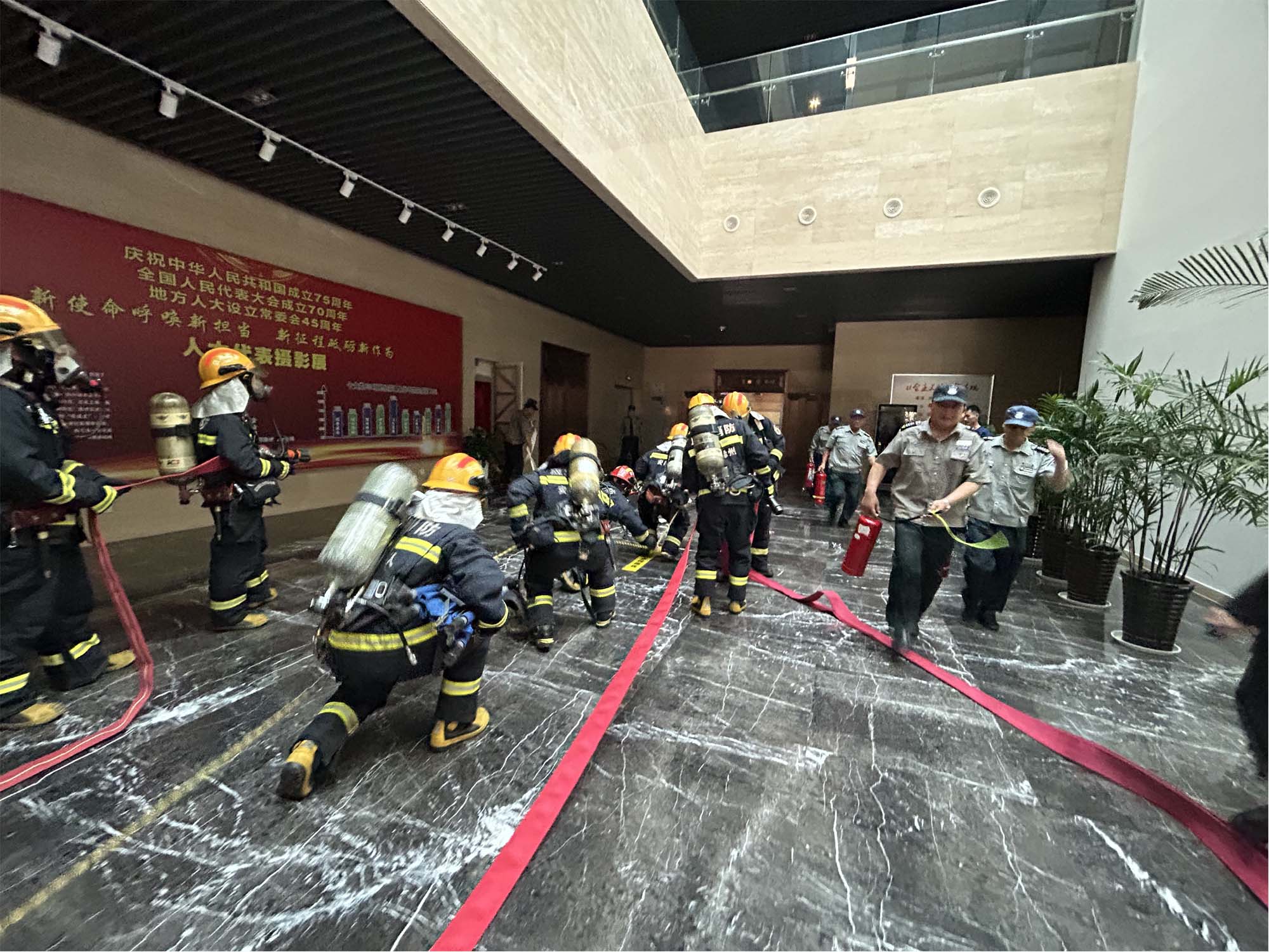 在滁州市消防救援支队花园路特勤站的指导下,消防演练正式开始。演练模拟一楼自然展厅火灾场景,随着警报响起,各应急小组迅速启动应急预案,灭火组立即赶到救火点进行灭火,疏散组按照既定的疏散路线引导馆内人员有序撤离到安全空旷地带。接到报警后,滁州市消防救援支队花园路特勤站出动消防车,展开灭火救援行动。在应急小组和消防队员的配合下,火情迅速被控制。