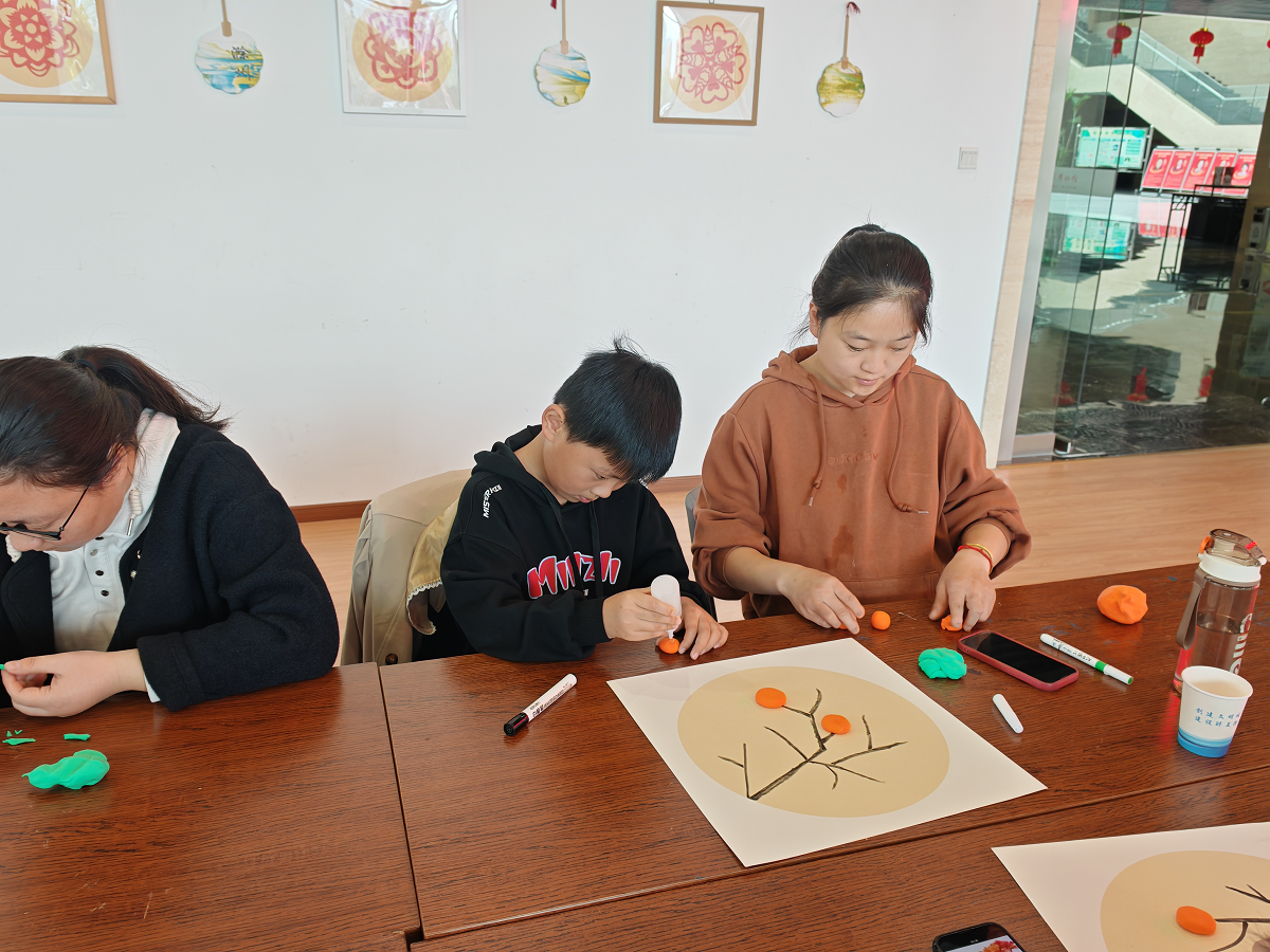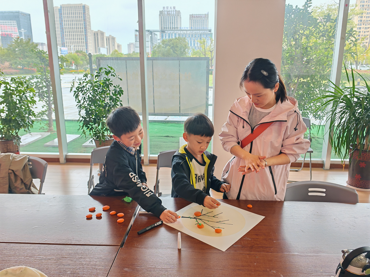 最后在手工制作环节,孩子们先用彩笔画出柿子树的树干和树枝,然后在讲解员的指导下,通过“揉一揉”“压一压”“捏一捏”“画一画”等动作,一颗颗饱满的“柿子”从孩子们灵巧的小手中诞生,再粘贴在树干的不同位置,涂上胶水、撒上盐,一幅好“柿”成“霜”画就做好啦,让孩子们在增强动手创作能力的同时,更好地感知多彩的秋天。