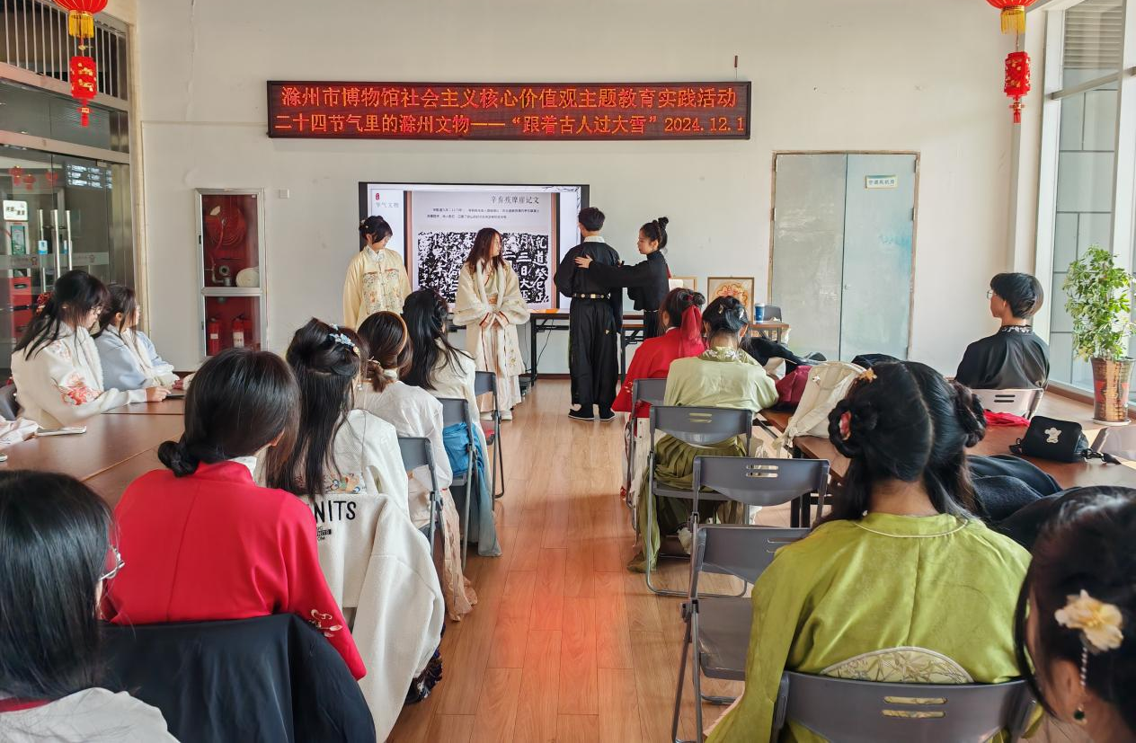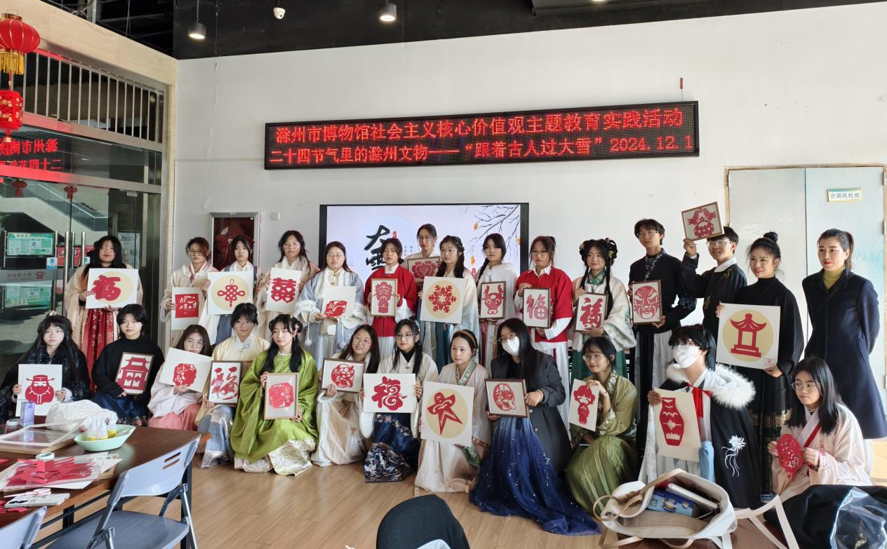 大雪,一个无比美妙的节气名字。透过它,仿佛可以看见漫天大雪纷纷扬扬,草木一片银装素裹,风吹来,素白的羽毛随风飘落。“大雪”是农历二十四节气中的第21个节气,更是冬季的第三个节气,标志着仲冬时节的正式开始。为弘扬中华传统文化,12月1日上午,必威betway精装版app联合琅嬛汉礼工作室、滁州学院开展了二十四节气里的滁州文物——“跟着古人过大雪”活动。