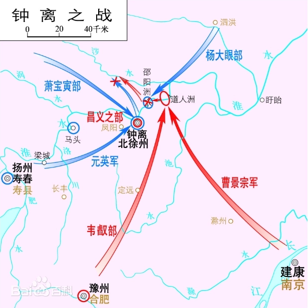 天监五年(北魏正始三年,506年)十一月,梁武帝诏令右卫将军曹景宗统二十万梁军援救钟离,豫州刺史韦睿也受曹景宗节度。萧衍让曹景宗先屯驻道人洲(今安徽凤阳东北淮河中),等待梁军各部集齐后并进。曹景宗想专功,便没有停顿,而是径直前进,不料忽起狂风,兵士溺死颇多,只得返回道人洲。