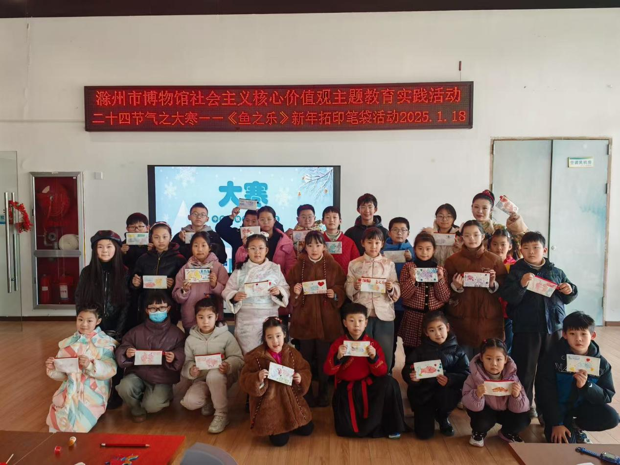 博物馆志愿者许薇老师从节气特征、各地习俗、节气养生以及大寒诗词等方面为青少年儿童们介绍了大寒节气的来历和意义。博物馆讲解员带领孩子们来到展厅,观看并介绍了《濠梁观鱼》的历史典故。拓印环节,大家发挥创意,用铅笔在吹塑板上刻画出了各种小鱼图案以及濠梁观鱼的镜面字体,再用彩色油墨印刷创造出一个个独一无二的笔袋。