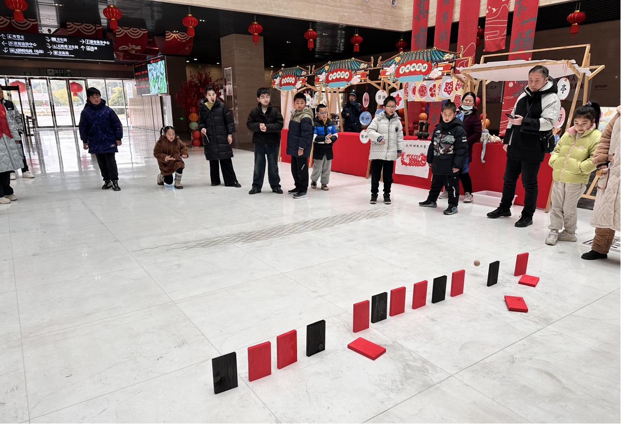 此次闹元宵包含猜灯谜、投壶、木射及寻宝四个环节。猜灯谜是元宵节的一项传统活动,承载着丰富的文化内涵,内容包含传统民俗、成语、地名、动物等多种类型。孩子们两人一组,有的脱口而出,有的默默沉思,有的在手里不停地比划,还有的久久想不出来转而求助家长。最终,每一组都猜出了谜底。