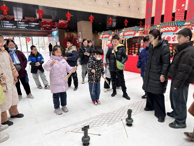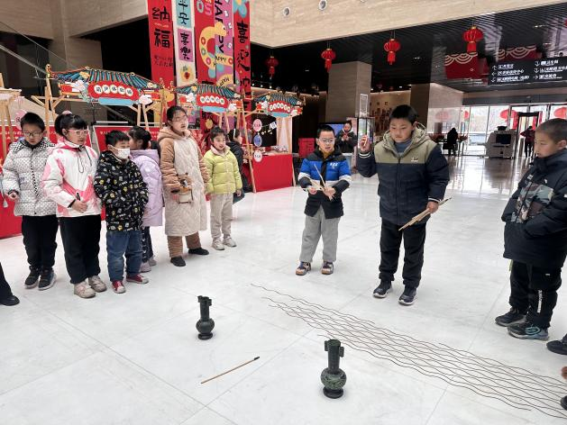 古人宴会上的“气氛担当”投壶是此次活动的亮点,因“壶”与“福”是谐音,也有投壶求福的美好寓意。听讲解员说完规则后,大家个个精神抖擞,全神贯注地寻找角度,手持箭矢,瞄准壶口,或稳准投入,或遗憾擦边,也有意外挂耳。活动现场加油声、叫好声、鼓掌声此起彼伏,气氛热烈浓厚。