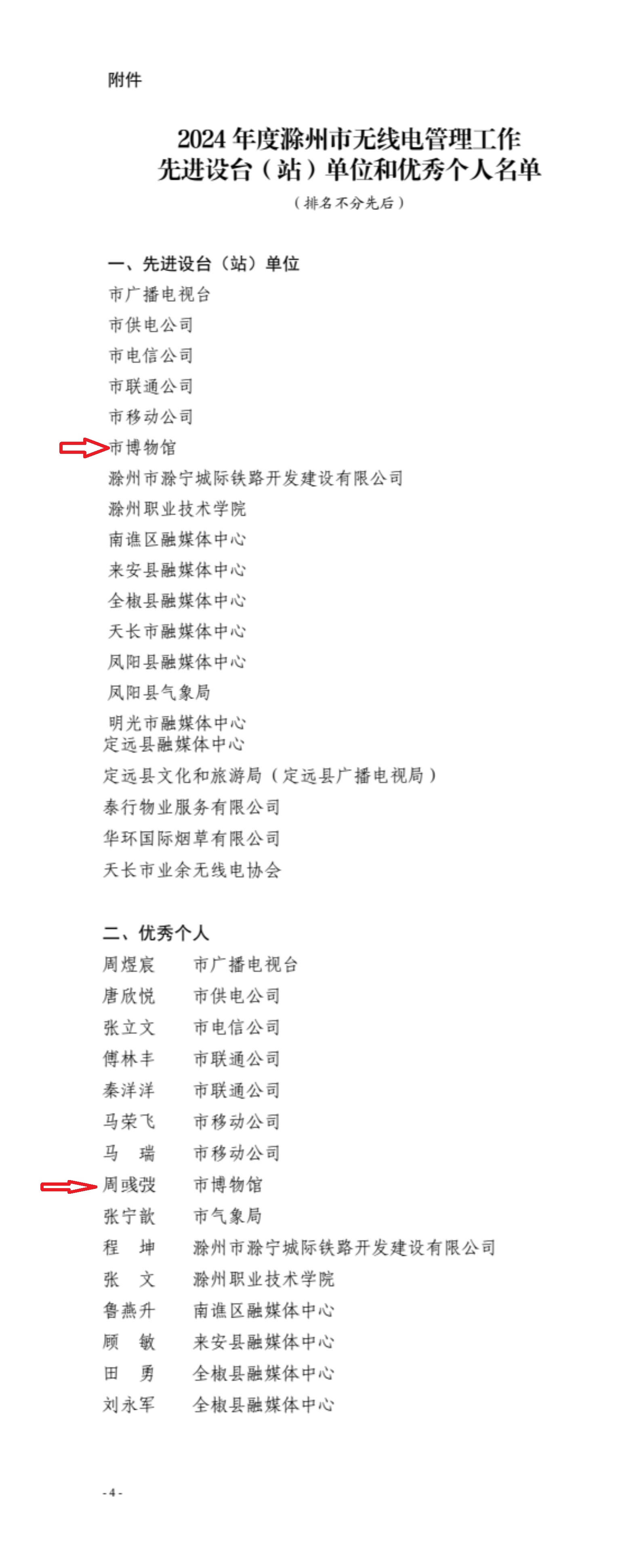 近日,滁州无线电管理局发布了《关于2024年度滁州市无线电管理工作先进设台(站)单位和优秀个人的通报》(滁无管局〔2025〕4号),我馆荣获2024年度滁州市无线电管理工作先进设台(站)单位称号,我馆职工周彧弢同志被评为2024年度滁州市无线电管理工作优秀个人。