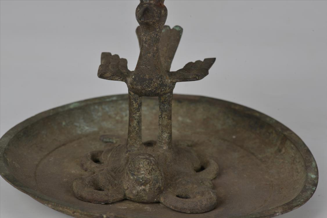 香炉也叫香薰炉。汉代的香熏炉不仅数量众多,而且造型变化多样,除了最经典的博山炉器型外,还有许多奇异的形制。必威betway精装版app馆藏的这件汉朱雀玄武香薰就属于异形香薰炉中的鸟形柱熏炉。它通高23cm,炉体口径7.8cm,重1.12kg,保存基本完整。炉盖被雕镂成山峦形状,山峰间有孔隙,香料点燃后,烟从孔隙中冒出来,云雾环绕,宛如仙境一般。炉柱造型最具匠心,是一只展翅欲飞的朱雀。朱雀双足下踏着一只玄武,下面连接着承盘。