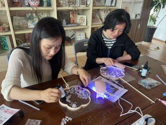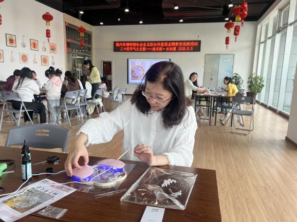 知识竞答环节结束后,便是令人期待的流水扇制作环节。活动现场,讲解员详细讲解流水扇制作技艺,流水扇采用速干滴胶制成,呈现出如潺潺流水般灵动的形态。扇面晶莹剔透,造型仿若灵动的水流,再巧妙点缀以娇艳桃花、灵动蝴蝶、高洁茉莉等充满生机的图案,兼具生动美感与超高观赏性。制作时,参与者们先用滴胶制作出透明扇面,然后粘上精美材料,再用树脂胶固定,经过一番精心创作,一幅幅栩栩如生的美丽画卷在扇面上徐徐展开,一把把独一无二的流水扇在大家手中诞生。看着自己亲手制作的作品,将传统工艺与个人创意完美结合,每个人脸上都洋溢着满满的成就感。