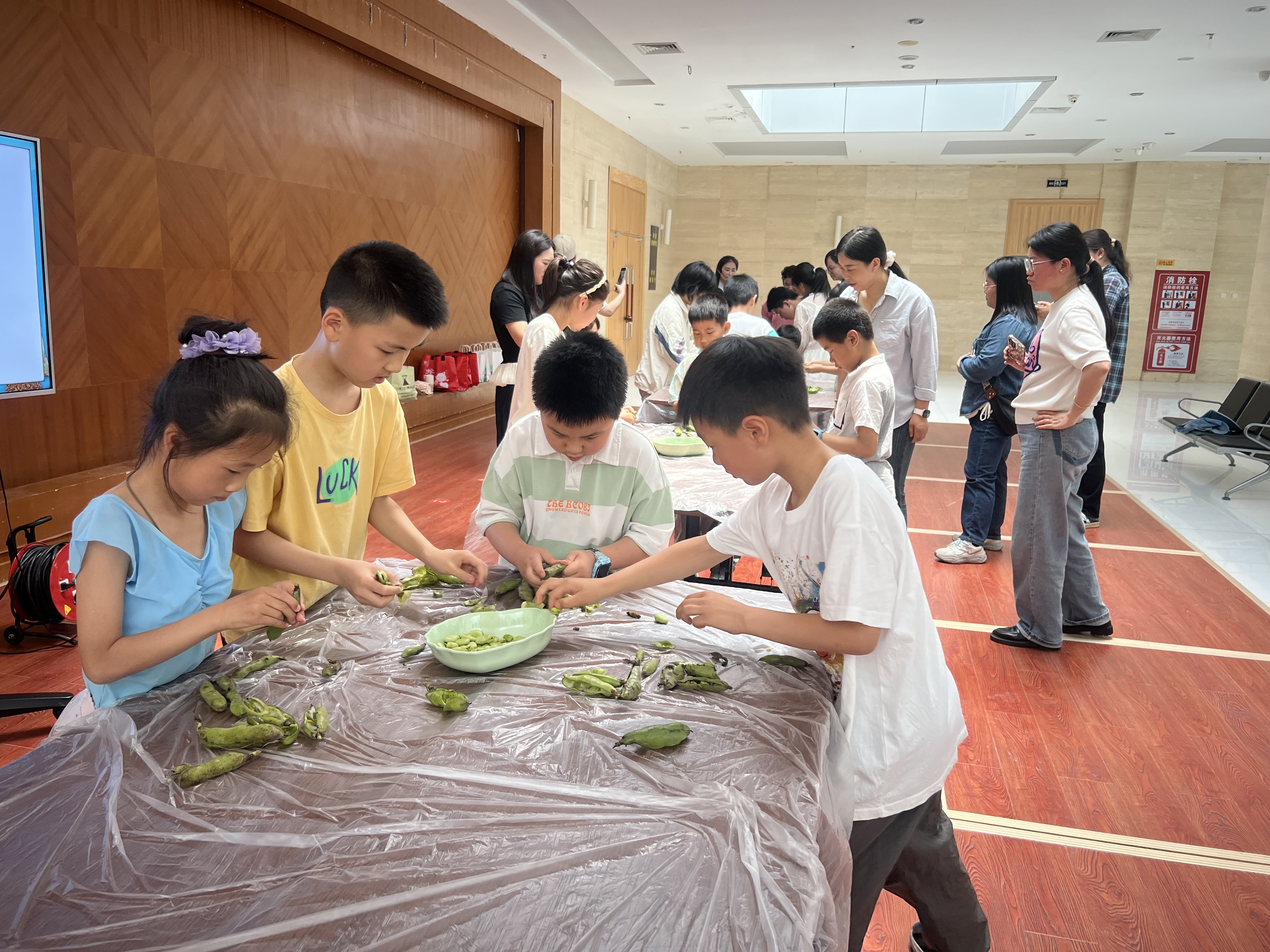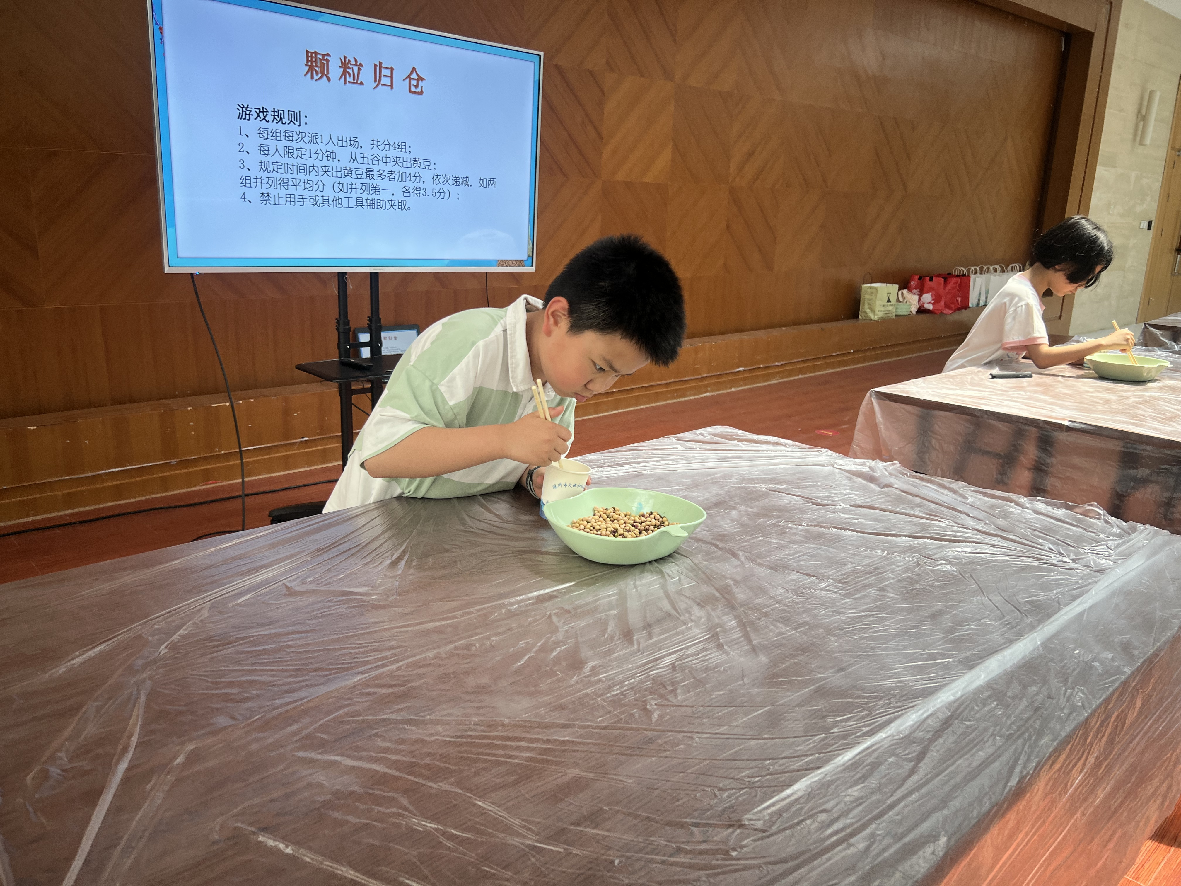 活动伊始,一场“你划我猜”游戏迅速点燃现场气氛。每组孩子们通过肢体语言与默契配合,在欢笑声中,让参与者了解了小满节气以及滁州文化特点。随后的分组农事体验环节将活动推向高潮。在“颗粒归仓”挑战中,孩子们用筷子夹起一颗颗圆溜溜的黄豆,小心翼翼送入“粮仓”,既考验手眼协调,又传递珍惜粮食的理念;“巧手剥蚕豆”比赛中,孩子们争分夺秒,手指翻飞间剥出饱满豆粒,体验收获的喜悦;最后的“麦穗分类”环节,参与者通过观察形态正确分辨出稻穗和麦穗,在动手实践中学习了农作物知识。
