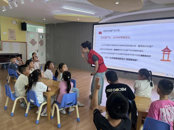 紧接着通过生动有趣的PPT介绍了我国丰富的文化和自然遗产,涵盖了历史悠久的古建筑、精美的传统手工艺品苗银以及宋锦,小朋友们听得津津有味,现场互动氛围热烈。