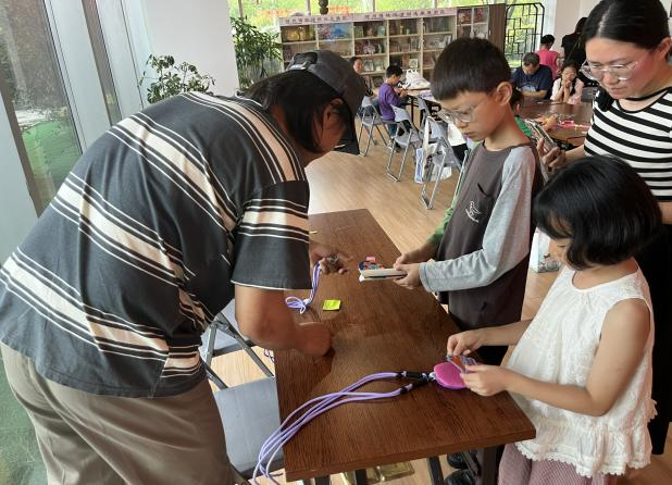 动手环节将活动推向高潮。本次选用轻盈透气的彩色网纱布料作为香囊外袋,赋予其清新时尚的视觉效果,缝制过程中,展厅内银针闪烁,彩线翻飞,孩子们专注地回针收边,家长细心指导打结技巧。在家长的协助下孩子们使用安全熨斗将精美的卡通贴画熨烫固定在网纱袋上,过程简单有趣,瞬间点亮香囊个性,最后放入散发天然清香的植物精油驱蚊棒,兼顾古意与现代健康需求,当一件件色彩缤纷、图案别致、散发清香的“时尚款”驱蚊香囊在手中诞生时,成就感与喜悦之情溢于言表。
