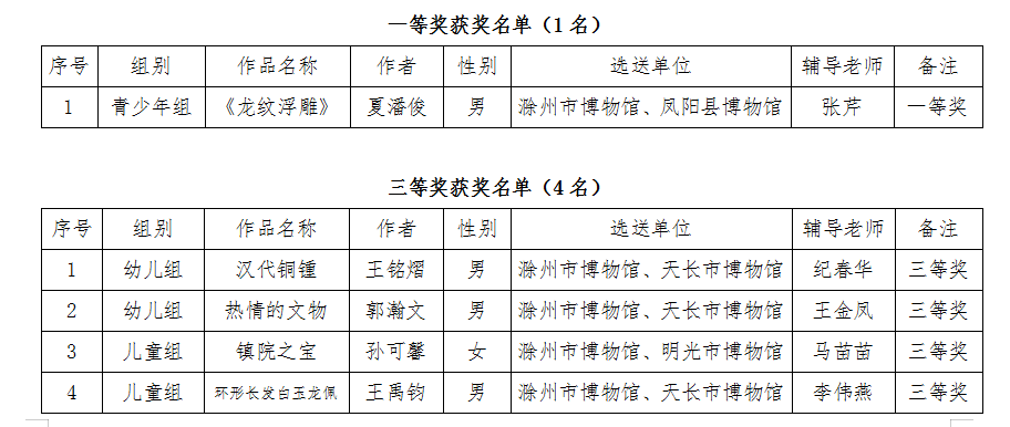在本次大展中,必威betway精装版app与凤阳县博物馆联合选送的青少年组作品《龙纹浮雕》(作者:夏潘俊,辅导老师:张芹)荣获一等奖。同时,我馆与天长市博物馆联合选送的幼儿组作品《汉代铜锺》《热情的文物》,以及与明光市博物馆、天长市博物馆联合选送的儿童组作品《镇院之宝》《环形长发白玉龙佩》均获得三等奖。此外,还有24件作品荣获参展奖。