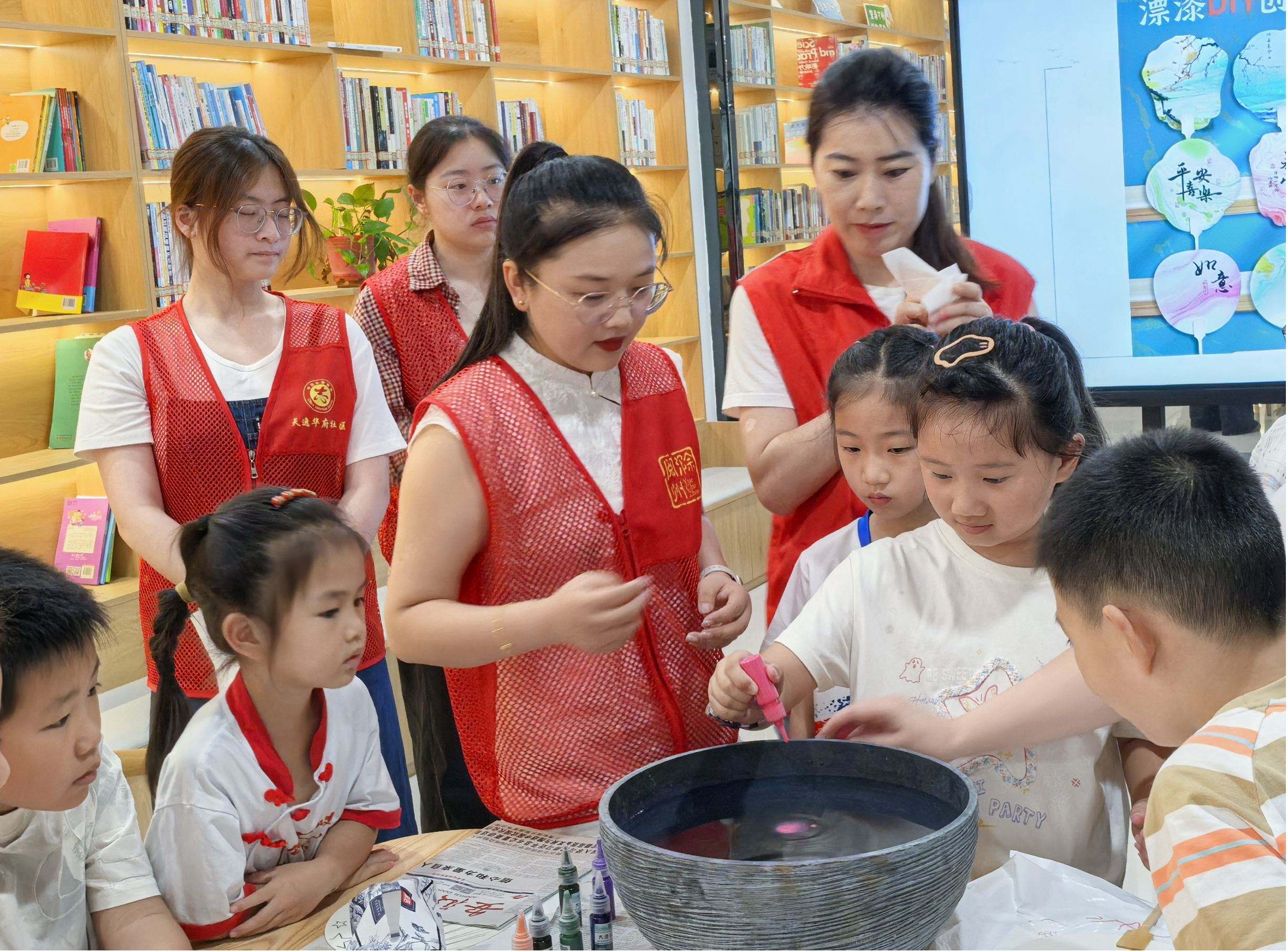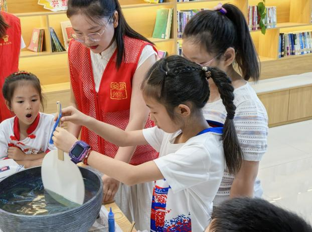 手工环节是备受期待的非遗漆扇制作体验。在老师们的帮助下,孩子们亲自动手,体验这门古老工艺的魅力。大家挑选心仪的颜色,将天然大漆滴入清水中,通过搅动形成独特的纹理,再将洁白的扇面缓缓浸入、提起,瞬间,一幅幅独一无二、流光溢彩的图案便神奇地附着在扇面上。小小的扇面承载着处暑的清凉意境,更凝结着对传统工艺的亲身感悟。