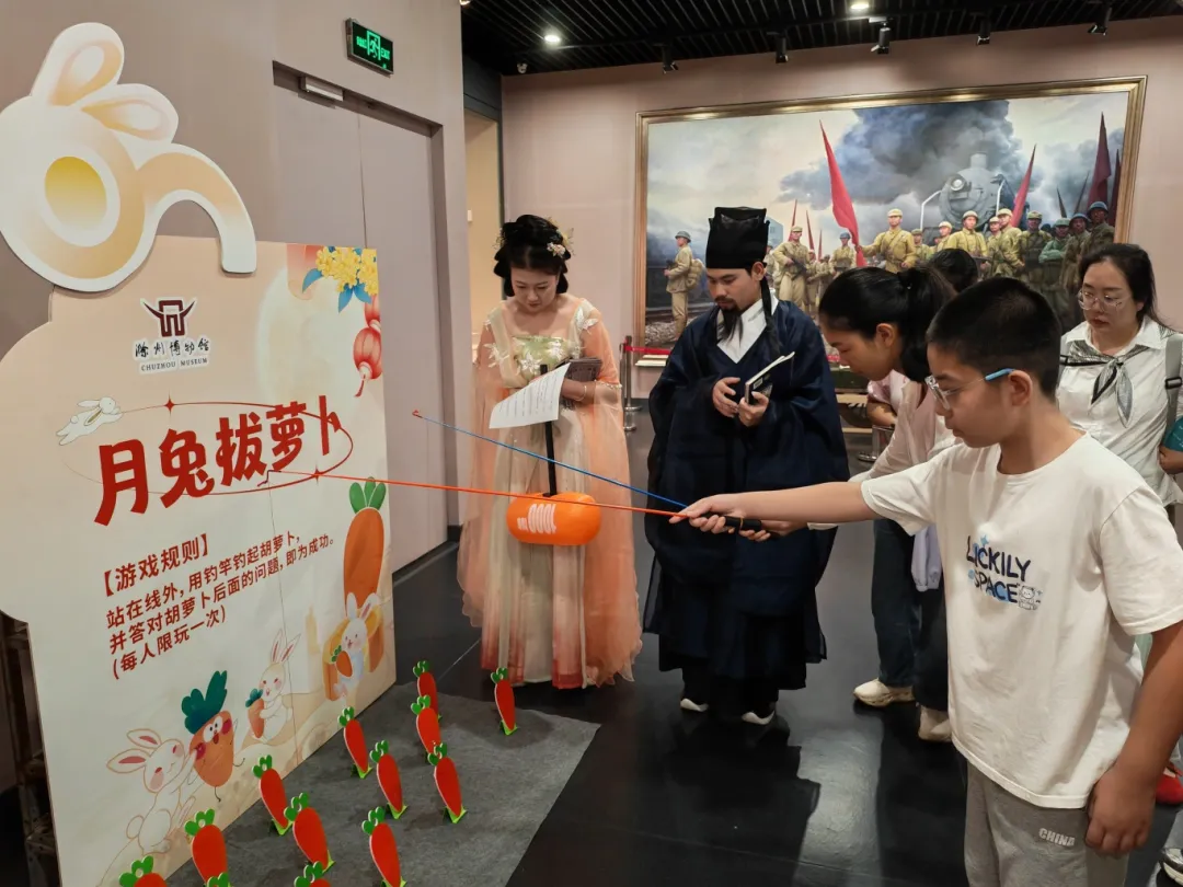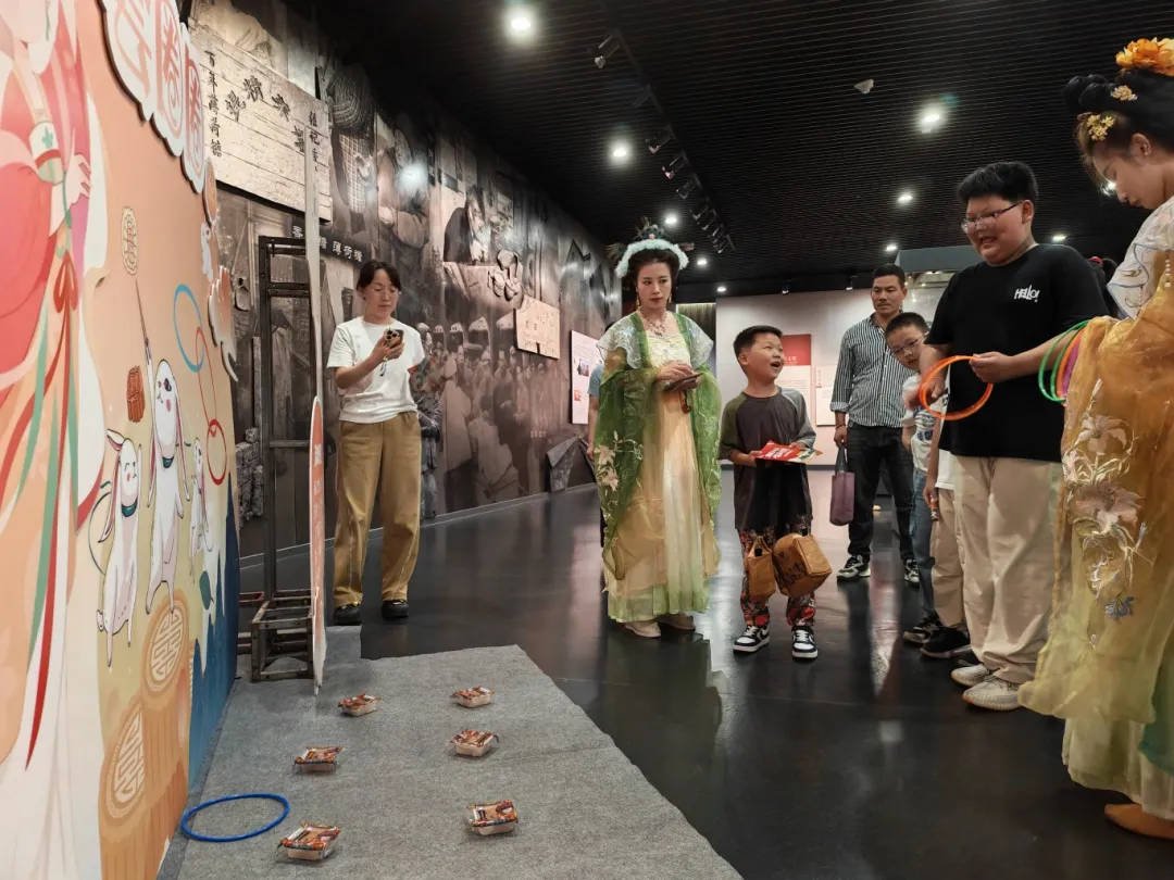 除了NPC互动,展厅旁的游戏区也非常热闹,投壶、飞花令、套圈、夹月饼、钓胡萝卜等传统中秋游戏,也将氛围感拉满。