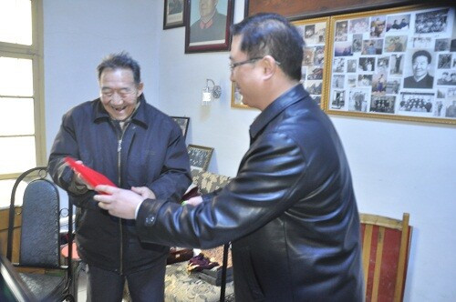 1月13日上午,市文广新局副局长马胜利一行到李永康老先生家看望,并向老先生颁发捐赠文物的荣誉证书。李永康老先是是汪道涵夫人戴锡可同志的表弟,今年已经86岁高龄,怀着对明光文化事业的关心和支持,向我局捐赠多幅有关汪道涵、戴锡可、胡坦等老革命家的旧照资料。这些革命旧照对我们后辈缅怀革命先烈的丰功伟绩,了解明光解放历史,保持优秀革命传统有着重要的意义和价值,是提升明光市民文化认同感、凝聚力、宣传爱国主义教育重要的实物资料。
