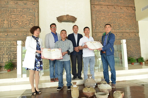 5月13日上午,市文物所和凤阳县文广新局、凤阳县博物馆接收了凤阳县群众汤文江上交的汉代陶鼎、陶盒、陶罐、陶瓿等九件文物,车光响上交的象牙化石1件。市文物所向上交文物的群众出具了《必威betway精装版app文物藏品征集登记表》,并颁发了荣誉证书,充分肯定了他们保护国家文物良好道德风范和新时期社会风气正能量。近年来,随着文物部门宣传文物保护相关法律、法规力度增大,我市群众的文物保护意识有了明显提高,个人主动上交文物的现象日益增多,有力的促进了我市文物保护事业的发展。