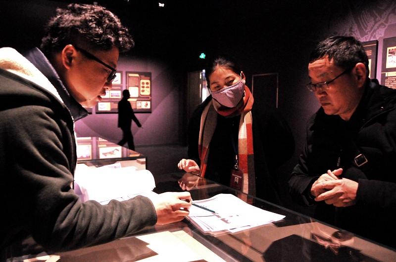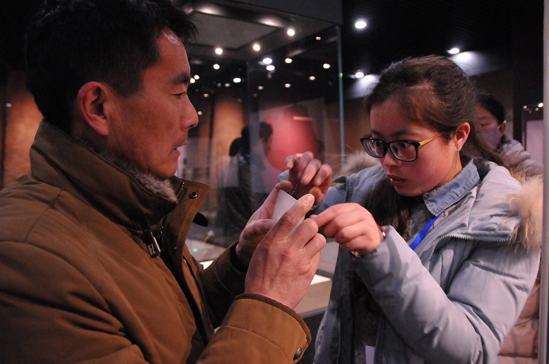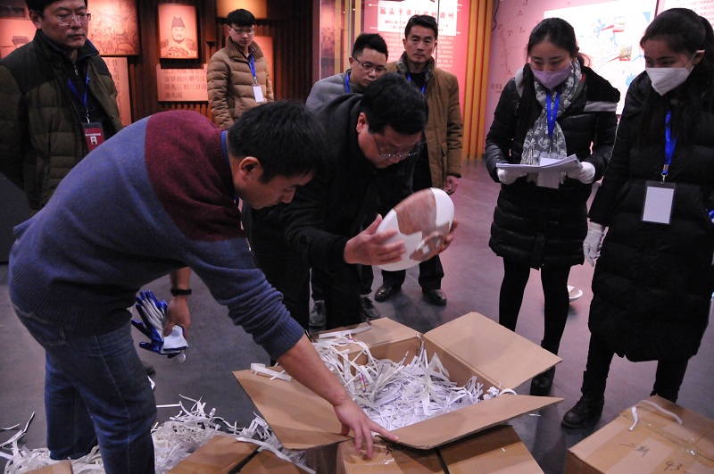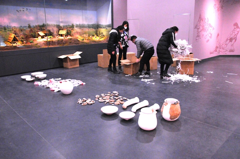 本次布展共有三个工作小组,分别负责一楼展厅矿石标本的上展、二楼历史厅第一单元和第二单元的文物上展工作。布展期间,三个工作小组各司其职,默契配合,全体职工在单位吃盒饭,18号晚上布展工作近11点,正是这种不怕苦不怕累的工作态度和热情,确保了第一阶段文物布展工作的顺利完成。