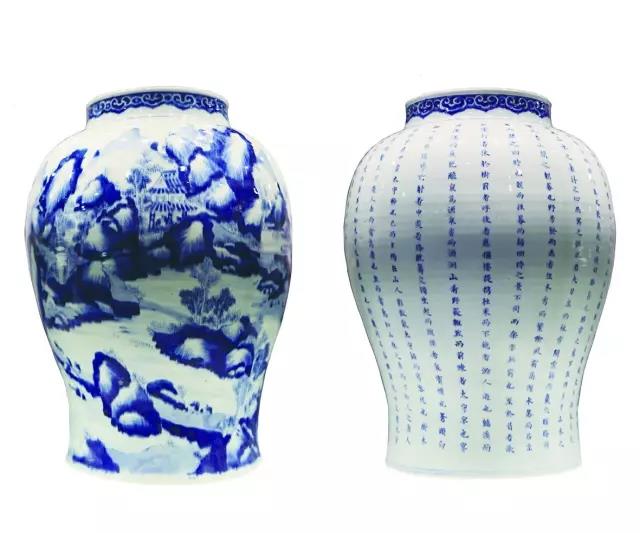 这对将军罐是我馆开馆时从江西省文物商店征集而来,两罐形质相同,高50厘米,口径20厘米,底径27厘米,上均书小楷《醉翁亭记》全文,并绘制《醉翁亭记》诗意山水图,图文并茂。该罐于清代康熙五十九年由景德镇民窑烧制而出,因瓷器体型庞大难以烧制,更书有欧阳修传世名作《醉翁亭记》,而显弥足珍贵。