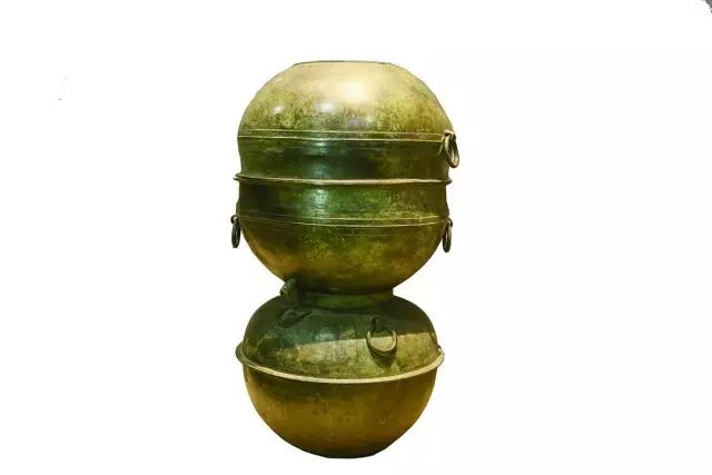 该铜甗为国家一级文物,蒸食器,由盖、甑、釜套合而成,通高48.5厘米,腹围84.8厘米,重6680克。铜甗上为弧腹平顶盖,腹部有弦纹,两侧有一对铺首衔环。中层为甑,圈足紧扣下层釜的口沿,底部有长条形箅隔,用于放置食物,箅上有一凸形沿,用于截留蒸发的液体,并留有一孔通往体外短流。下层为釜,内置水,上腹有一对铺首衔环,肩部有一马蹄形凸槽,槽中有一孔,正对甑部的短流,用于回收甑部流出的液体,循环利用。铜甗体量大,设计科学巧妙,不失为汉代蒸食器的精品。