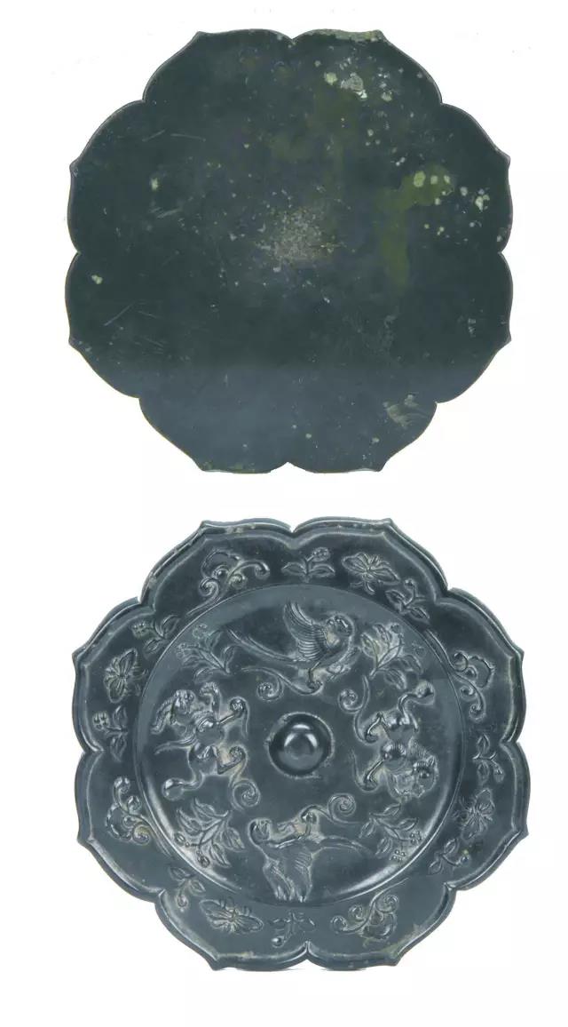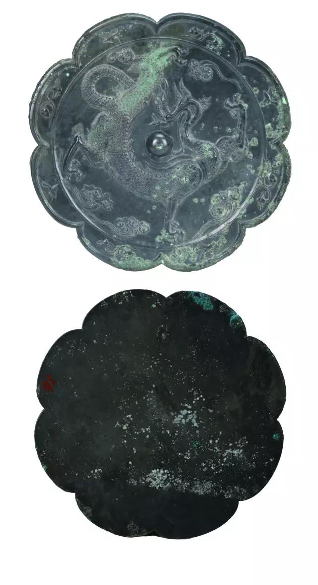此铜镜直径28.8厘米,厚0.8厘米,质量2630克,为我馆藏一级文物,形似八瓣葵花,圆钮有穿,镜背装饰一条口含宝珠腾空跳跃的飞龙,间或装饰四朵云纹,线条飘逸,八瓣内饰有四组短尾鸟环绕嬉戏折枝莲花图。该镜器形硕大,制作精良,在安徽地区较为少见,为盛唐时期铜镜的代表作品,飞禽走兽、植物花卉是这个时期铜镜装饰的主要题材。
