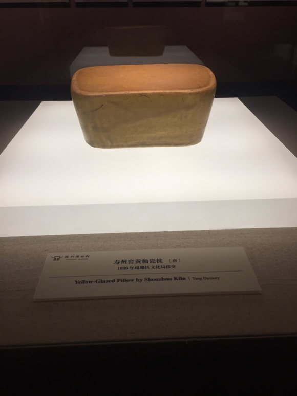 此瓷枕为我馆藏一级文物,长21厘米,宽15厘米,高8.5厘米,产于寿州窑,平面近似方形,枕面中部微凹,底部有一圆形小孔,釉色纯正发黄,是一件近乎完美的瓷器。寿州窑在今安徽省淮南市,始烧于隋代,兴盛于唐代,以首创黄釉瓷而著称于世,名列唐朝各大窑口第五。唐陆羽《茶经》记载:“寿州瓷黄色紫”。