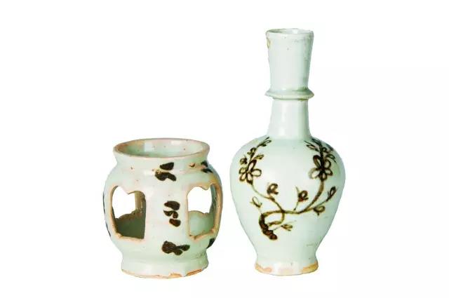此瓶通高22厘米,重360克,为景德镇窑烧制,国家一级文物。瓶直口,长颈,丰肩,鼓腹,圈足内凹露胎。腹部饰青花缠枝梅花纹,底隶书“严”字。座一件,圆口,直颈,鼓腹中空,圈足外撇。腹部四窗形镂空,两两对称,饰青花变体莲瓣纹。瓶、座可分离。据专家鉴定,应为一组供器。