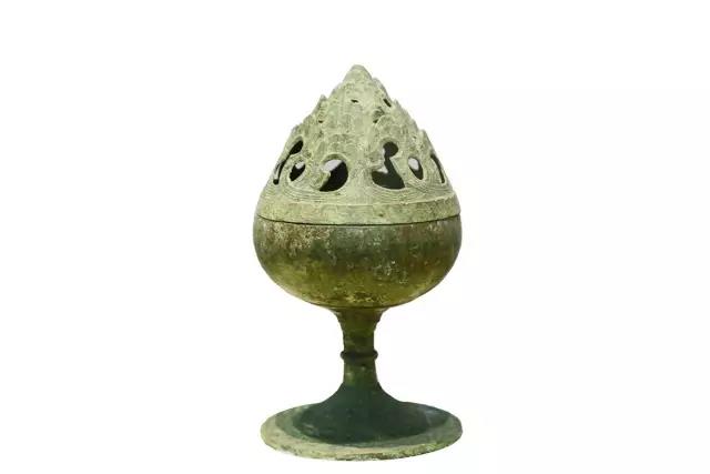 通高23.3厘米,重1310克,为我馆藏二级文物,由炉身、炉盖组成,子母口,炉身半球形,鼓腹,素面,柄为圆柱形,底座圆形,饰缠枝花纹,炉盖镂空作博山状。博山炉又叫博山香炉、博山香薰、博山薰炉等名,是中国汉、晋时期汉族民间常见的焚香所用的器具。