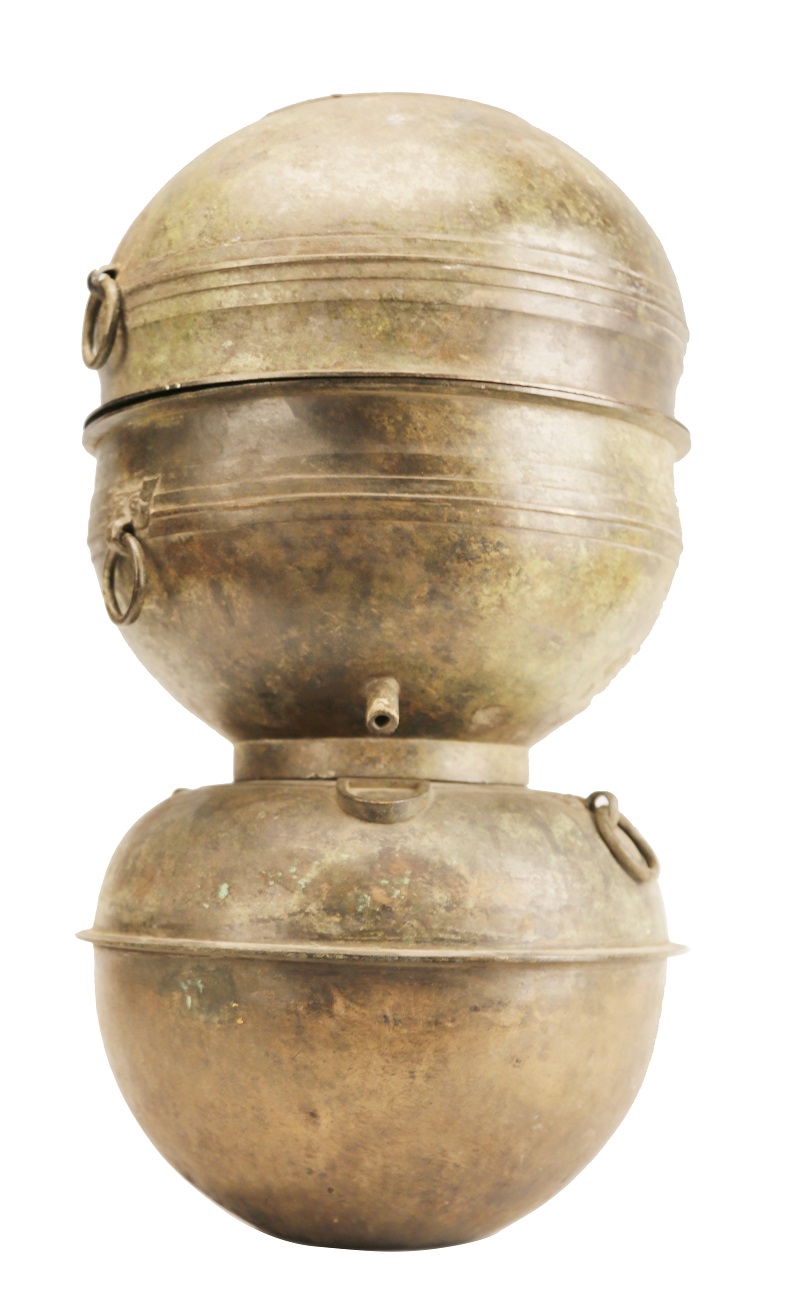 该铜甗为国家一级文物,蒸食器,由盖、甑、釜套合而成,通高48.5厘米,腹围84.8厘米,重6680克。铜甗上为弧腹平顶盖,腹部有弦纹,两侧有一对铺首衔环。中层为甑,圈足紧扣下层釜的口沿,底部有长条形箅隔,用于放置食物,箅上有一凸形沿,用于截留蒸发的液体,并留有一孔通往体外短流。下层为釜,内置水,上腹有一对铺首衔环,肩部有一马蹄形凸槽,槽中有一孔,正对甑部的短流,用于回收甑部流出的液体,循环利用。铜甗体量大,设计科学巧妙,不失为汉代蒸食器的精品。