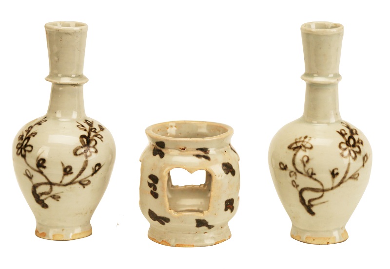 此瓶通高22厘米,重360克,为景德镇窑烧制,国家一级文物。瓶直口,长颈,丰肩,鼓腹,圈足内凹露胎。腹部饰青花缠枝梅花纹,底隶书“严”字。座一件,圆口,直颈,鼓腹中空,圈足外撇。腹部四窗形镂空,两两对称,饰青花变体莲瓣纹。瓶、座可分离。据专家鉴定,应为一组供器。