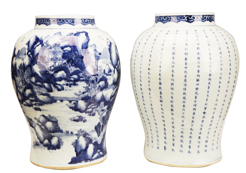 这对将军罐是我馆开馆时从江西省文物商店征集而来,两罐形质相同,高50厘米,口径20厘米,底径27厘米,上均书小楷《醉翁亭记》全文,并绘制《醉翁亭记》诗意山水图,图文并茂。该罐于清代康熙五十九年由景德镇民窑烧制而出,因瓷器体型庞大烧制难度大,更书有欧阳修传世名作《醉翁亭记》,彰显滁州地域文化,而显弥足珍贵。