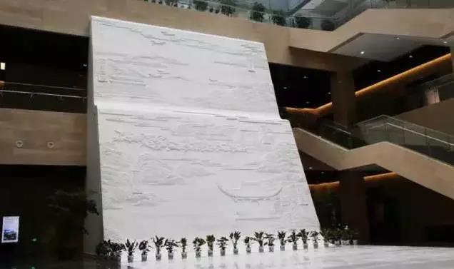 中厅展区主要展线的是一座巨型的雅士白大理石浮雕,立面高12米、宽9米,地面延伸长达35米,形如徐徐展开的山水画卷。浮雕的内容为淮河、中都鼓楼、清流关、琅琊山、醉翁亭、长江,它们首尾呼应,代表着滁州独特的地理区位,蕴含着滁州厚重的历史人文,整个画卷在不同位置分布着铜条镶嵌的水波纹,寓意着滁州历史文化脉络如长江淮河一样绵延流长。