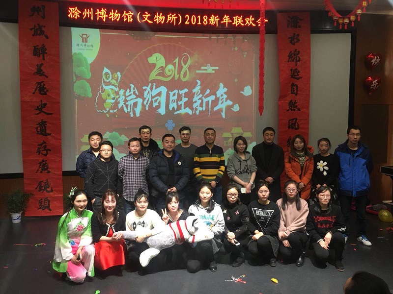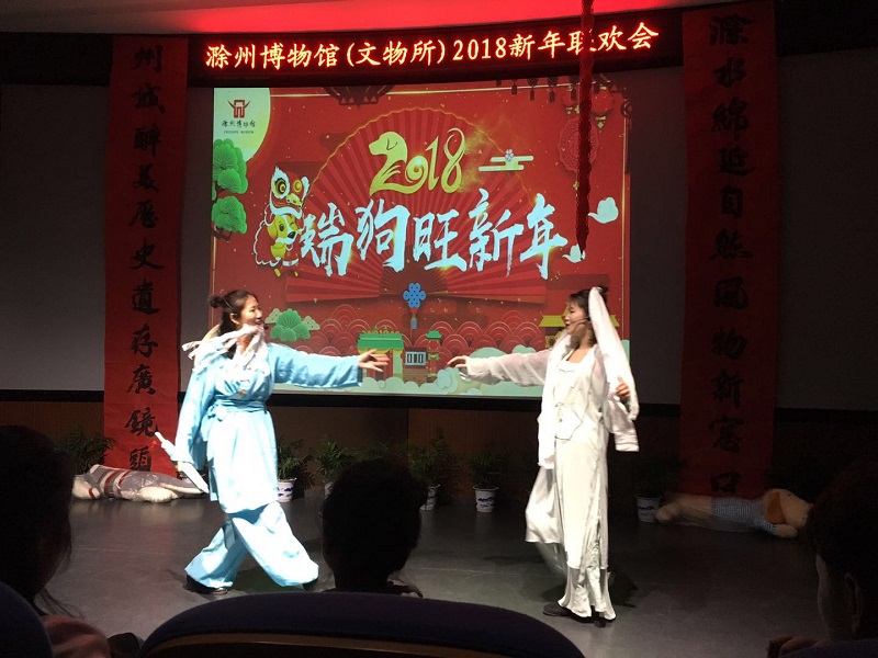 博物馆职工、物业员工、特邀嘉宾等共同为观众奉献了一台喜庆热烈、精彩纷呈的文艺演出。整台晚会主题鲜明、昂扬向上,有展示博物馆年轻员工青春活力的集体舞《咖喱咖喱》,有物业带来的黄梅戏《夫妻双双把家还》、有有趣搞笑的互动游戏,有特邀嘉宾带来的沙画表演和古筝演奏,博物馆员工杨雅南、胡菲菲自编自导的小品剧《渡情》将晚会带入高潮,一个个精彩的演出热情抒发了在习近平新时代中国特色社会主义思想引领下,博物馆全体职工深入学习宣传贯彻党的十九大精神,不忘初心、牢记使命,埋头苦干、拼搏进取的滁州文博人精神。