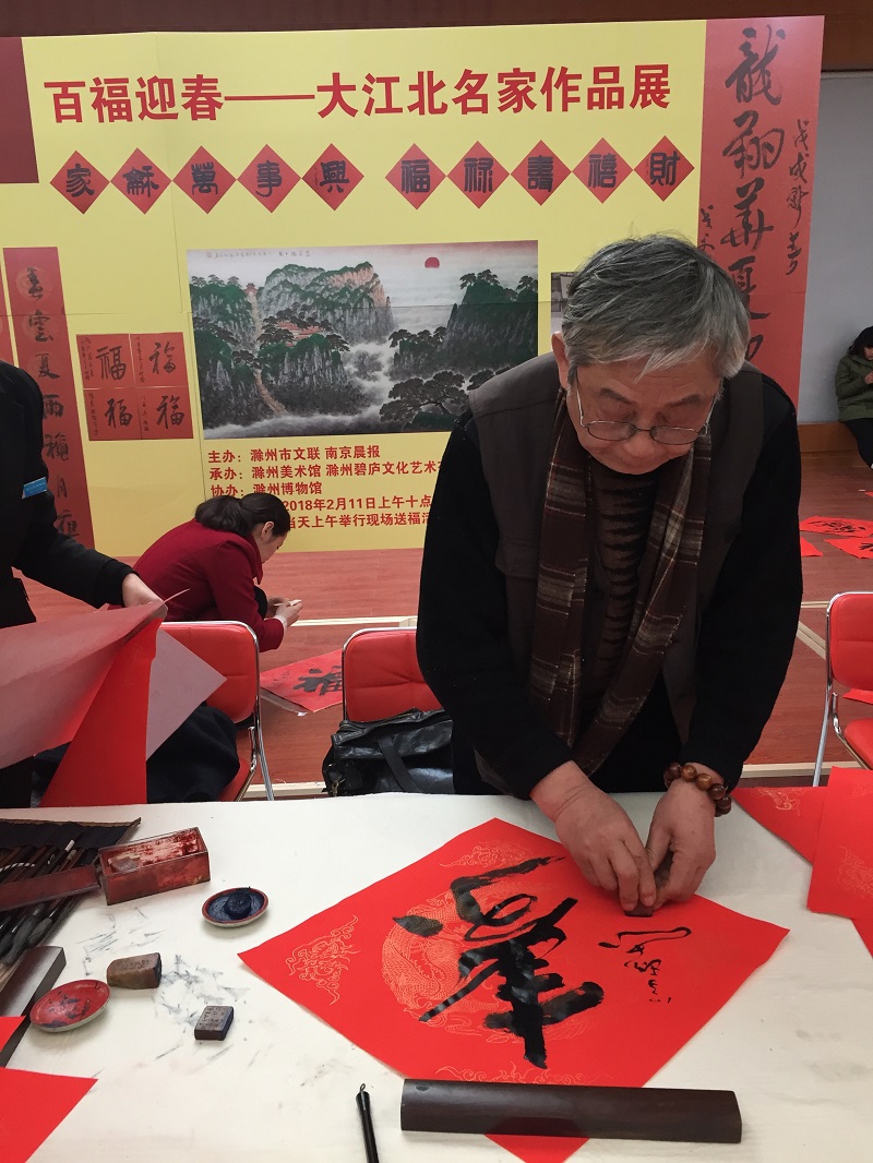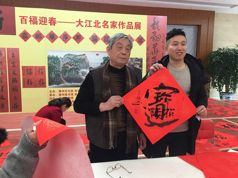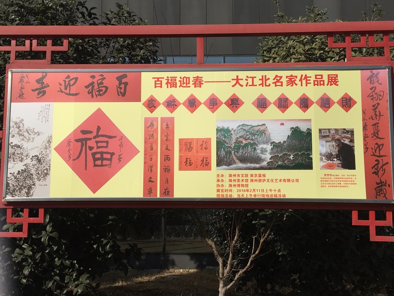 为弘扬优秀传统文化,表达对广大市民最诚挚的节日祝福,由滁州市文联、南京晨报主办,滁州美术馆、滁州碧庐文化艺术有限公司承办,滁州博物馆协办的“百福迎春——大江北名家作品展”于2018年2月11日上午在滁州博物馆•美术馆成功举办。活动现场有中国书法家协会会员李学珍等著名书法家写对联、福字送给群众。场面气氛活跃、热闹非凡,本次活动以春联为载体,通过为广大市民题写春联,营造了过大年欢乐祥和的氛围。