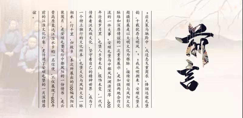 活动主题:“我从明朝来”主题摄影展是以大明文化为根脉,接续安顺与凤阳文化脉络和深厚情谊的一次重要展示,是加强两地合作交流的一件大事。安顺屯堡与中都凤阳渊源深厚。600年沧桑岁月里,屯堡人乡音未改,服饰未变,一代代传承着汉民族文化,坚守着自己的精神世界,成为了一个特立独行的文化样本。屯堡文化与凤阳文化一脉相承。行千里,归故乡,本次所展出的100幅凤阳汉装图片,是安顺屯堡写给中都凤阳的一份情书,是云贵高原直达江淮水乡的一名信使,不仅展现了600年前的江淮文化印象,更传递了安顺屯堡的一片深情厚谊。