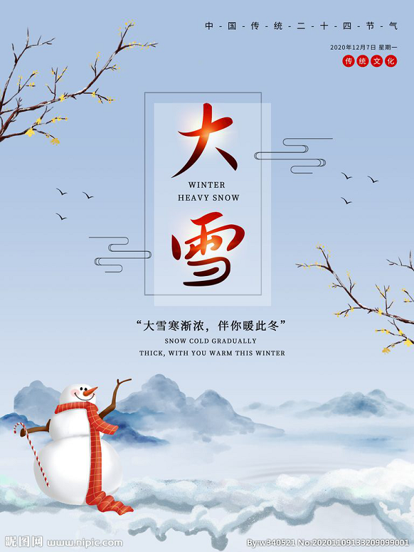 “大雪”节气是农历二十四节气中的第21个节气,是冬季的第三个节气,标志着仲冬时节的正式开始;大雪节气时间一般为每年公历12月6-8日。