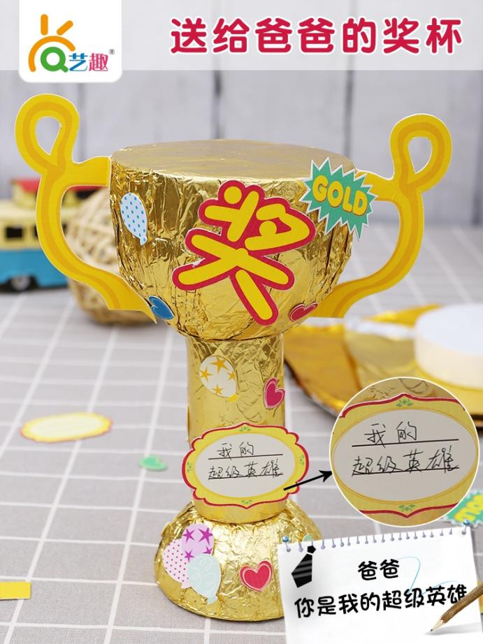 3、“我为爸爸做奖杯”。小朋友亲手制作一个奖杯并颁发给自己的爸爸,表达对爸爸的感谢和爱意。