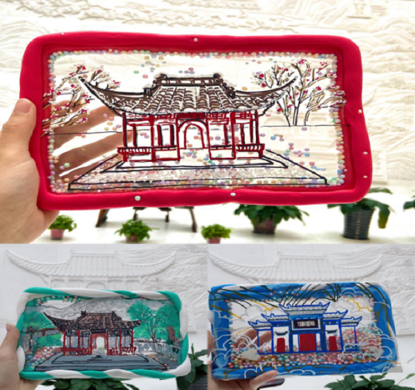 3.教师示范教学,学生体验DIY制作雪景画,绘画醉翁亭或博物馆场景雪景画;