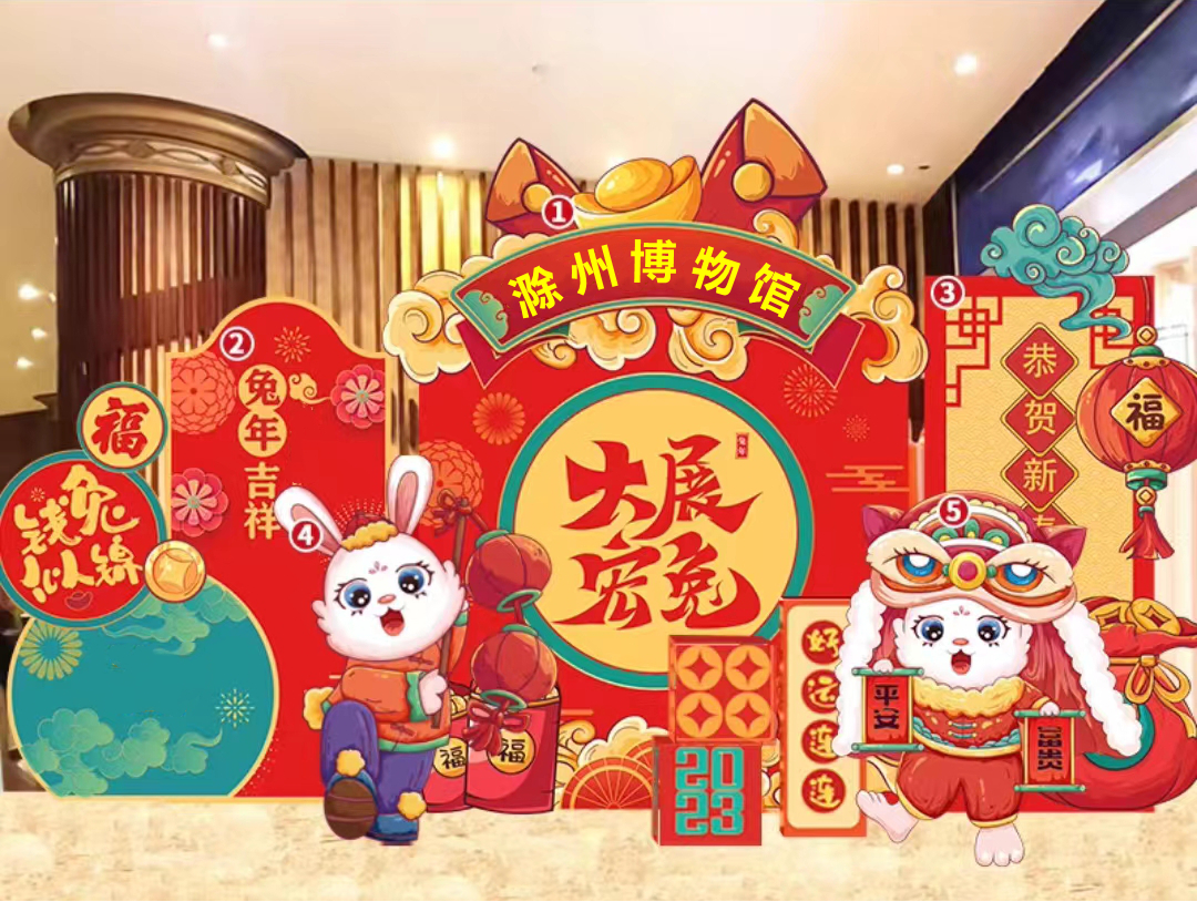 1.在博物馆一楼大厅兔年装饰布景处拍照打卡;