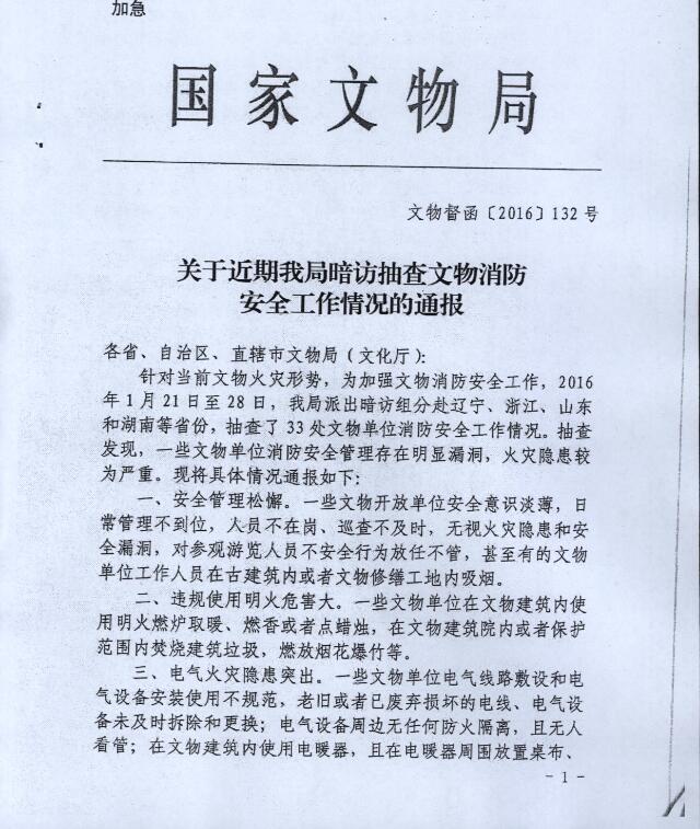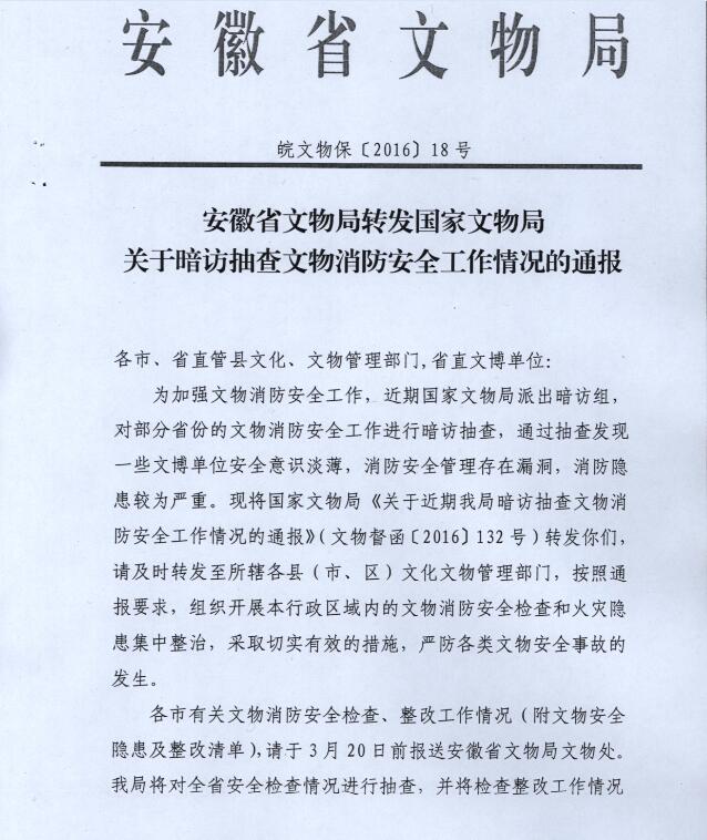 安徽省文物局转发国家文物局关于暗访抽查文物消防安全工作情况的通报