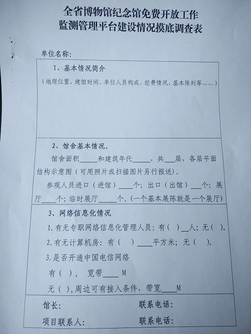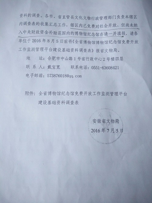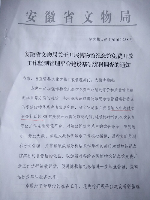 转发《安徽省文物局关于开展博物馆纪念馆免费开放工作监测管理平台建设基础资料调查的通知》