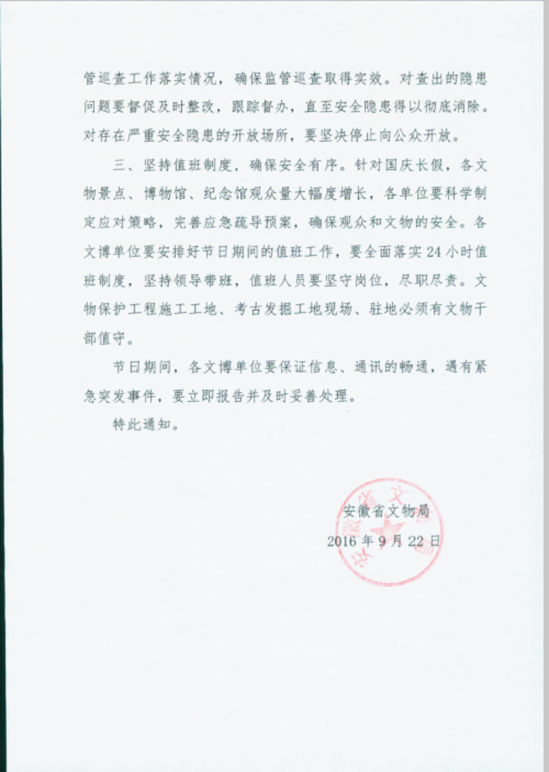 安徽省文物局关于做好2016年国庆期间文物安全工作的通知