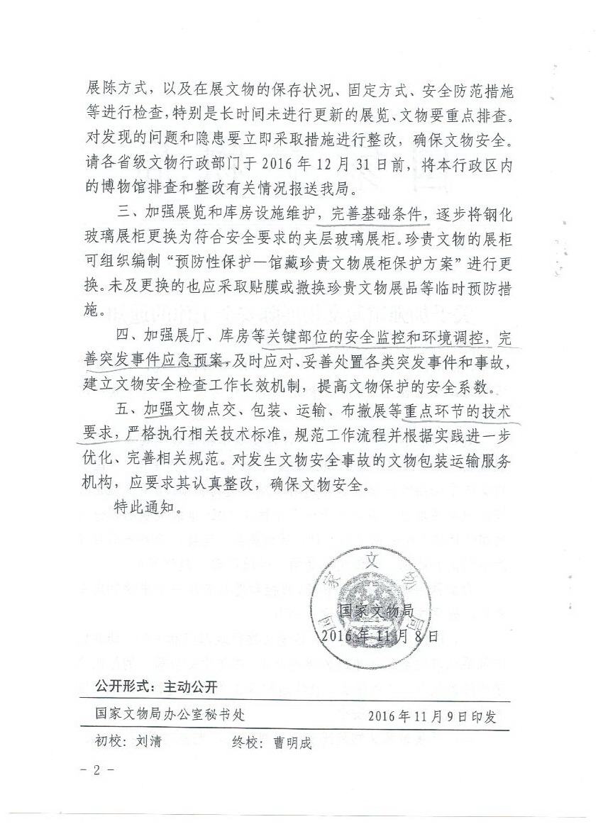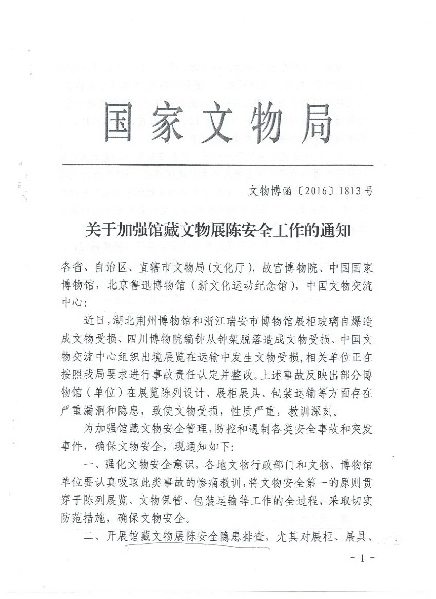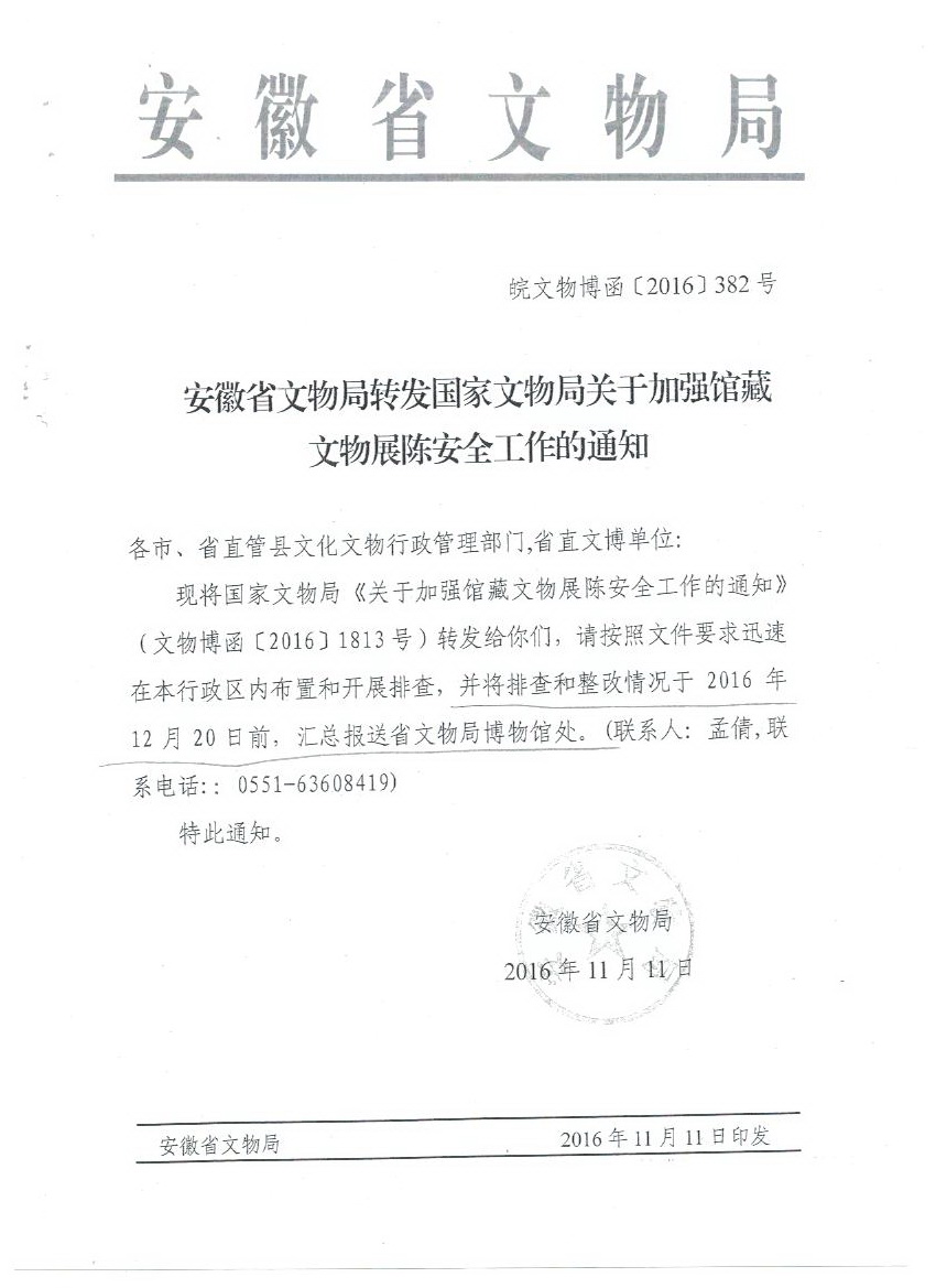 安徽省文物局转发国家文物局关于加强馆藏文物展陈安全工作的通知